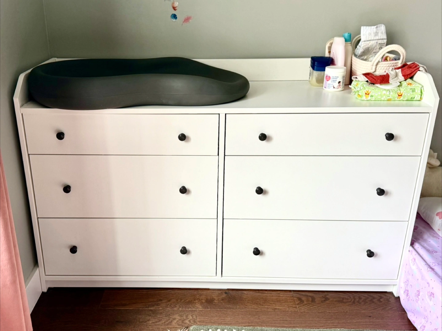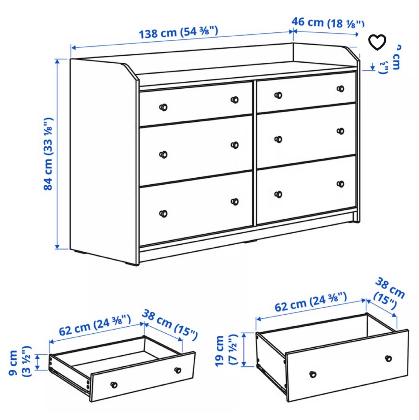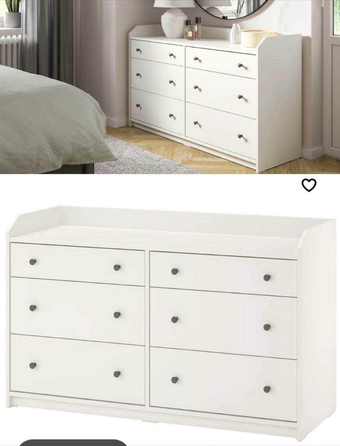 Pick up only near Woodmount and Cosburn. Must have own transportation and one of us can help carry downstairs and out to front porch. Cash preferred. Ikea Hauga 6 drawer dresser, good condition. Purchased in 2021 for $220 and discontinued on Canadian Ikea, so product photos are from Ikea UK. Please check photos for dimensions. Please note: - Top corner has some visible wear and we repaired it, so functions fine - Drawer contents are not included and only to show carrying capacity and how we used it