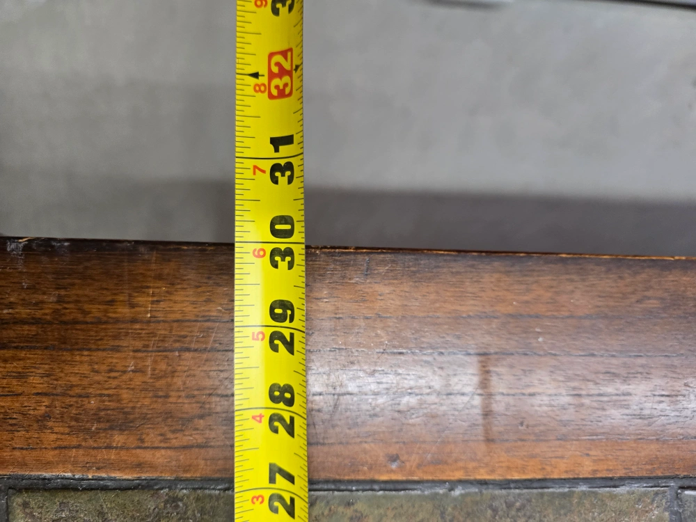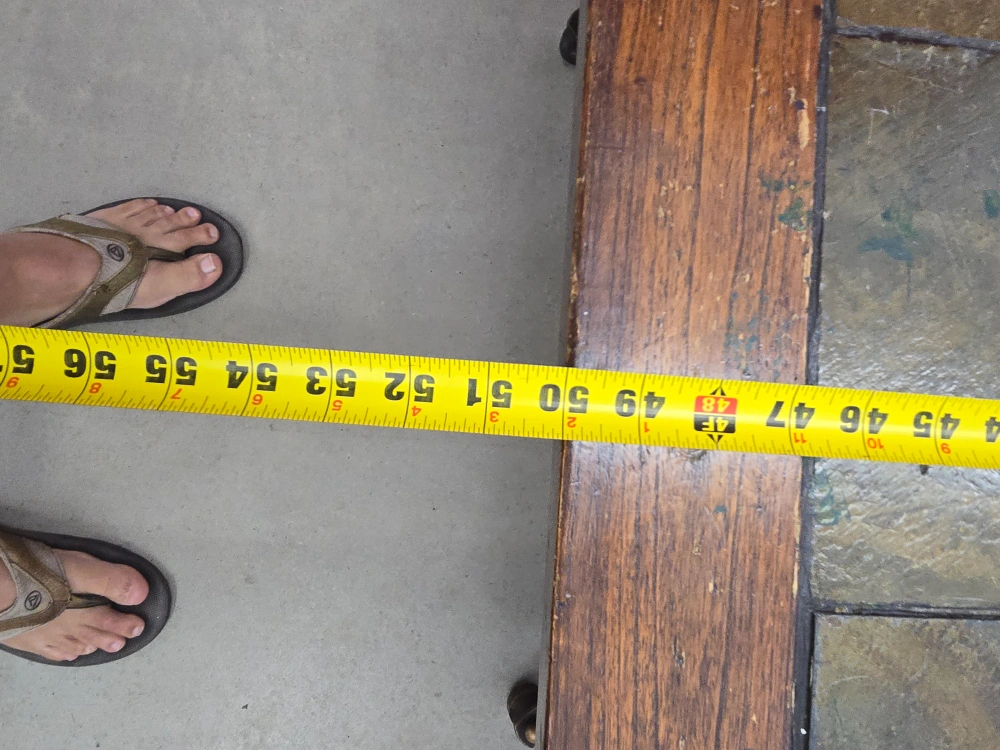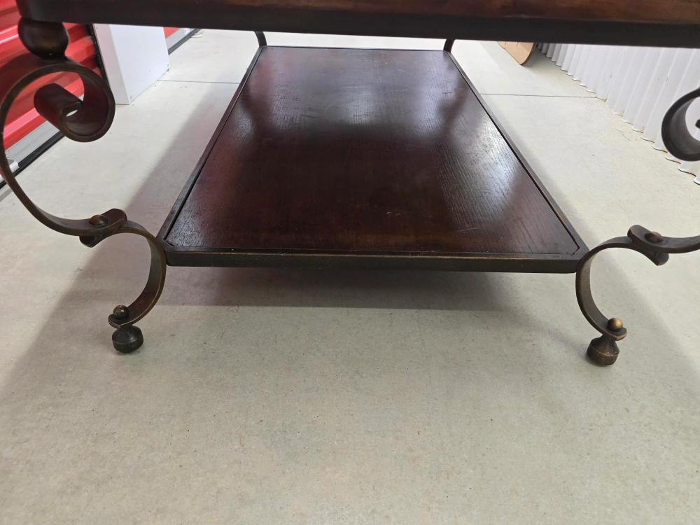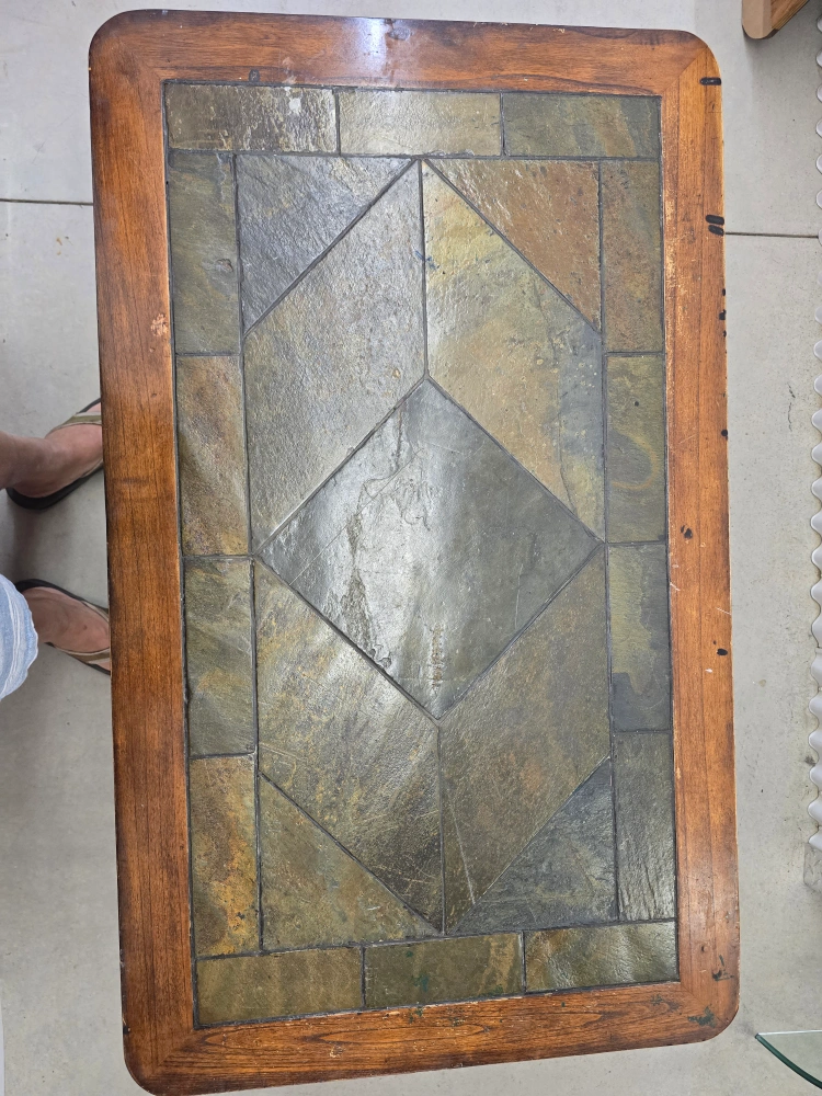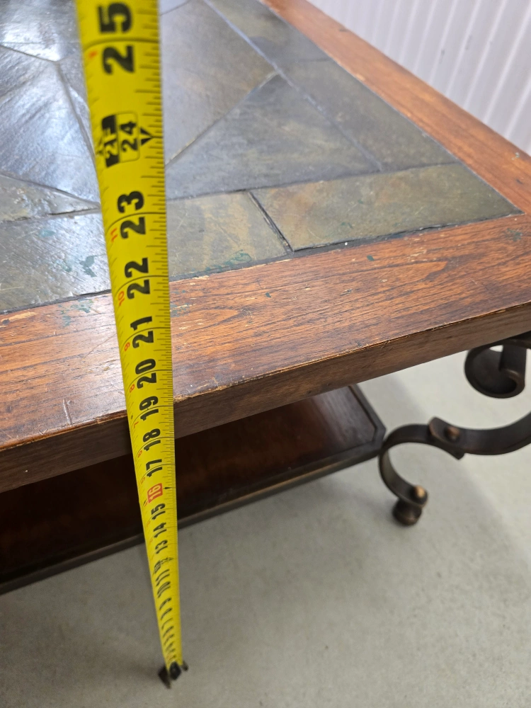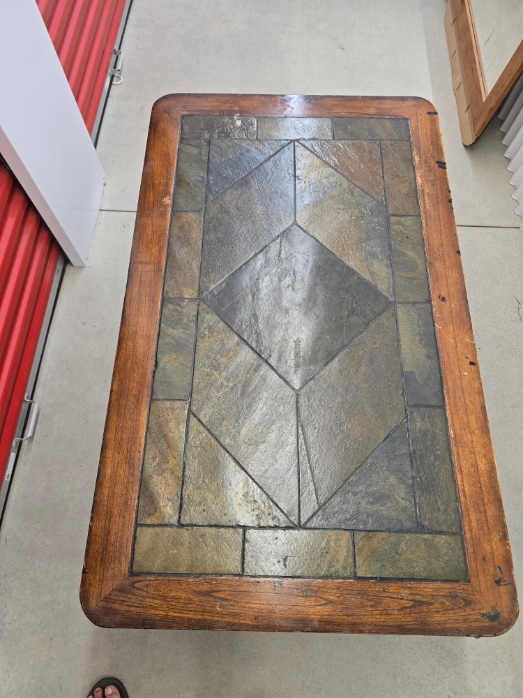 This is a wood coffee table with a slate tile inlay on top. It measures approximately 55 inches long and 30 inches wide. It also has a lower shelf for storage