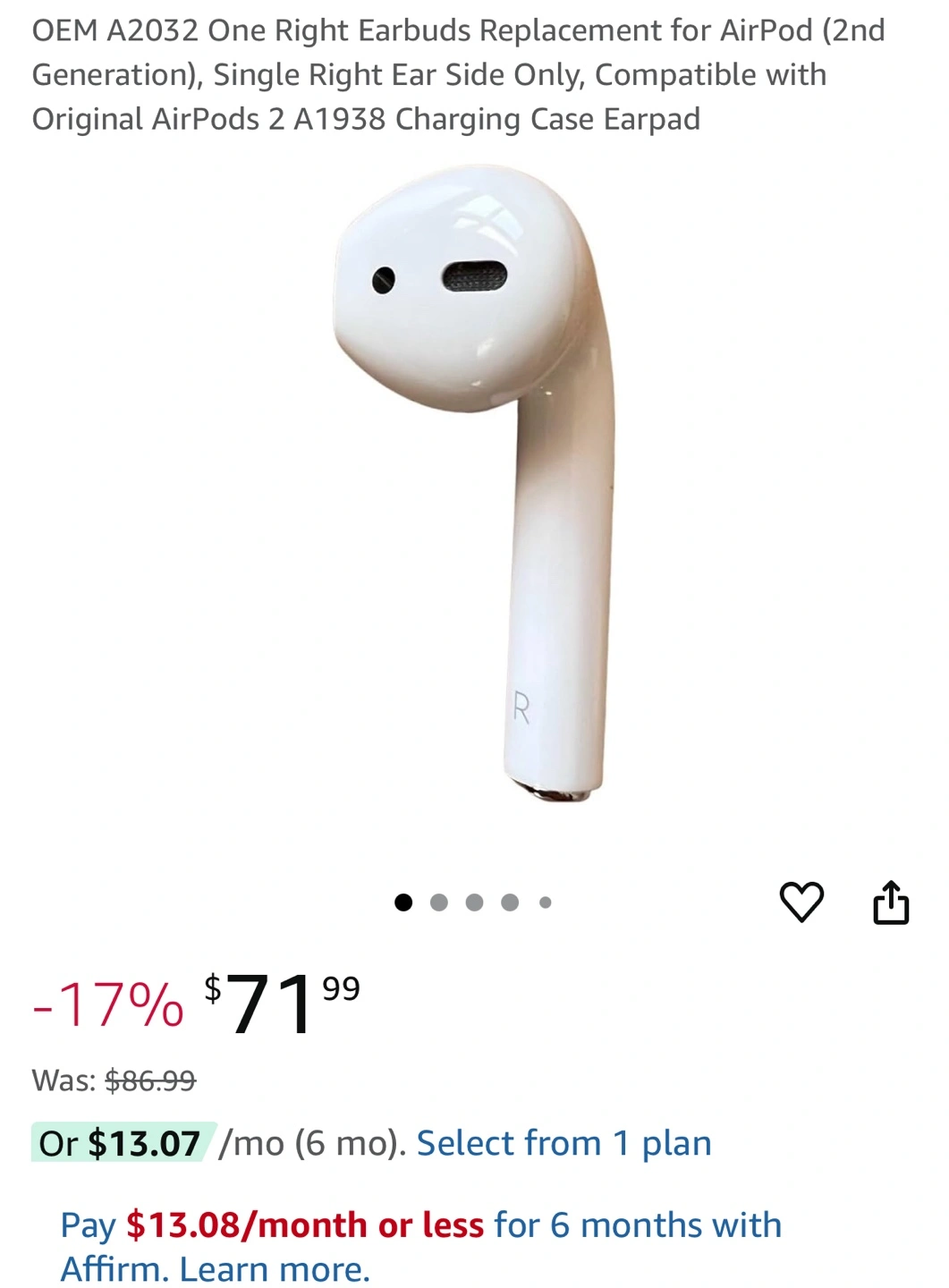 Right Apple AirPods (2nd Gen) Right Ear Replacement Only. Pick up in Old Carriage Dr.