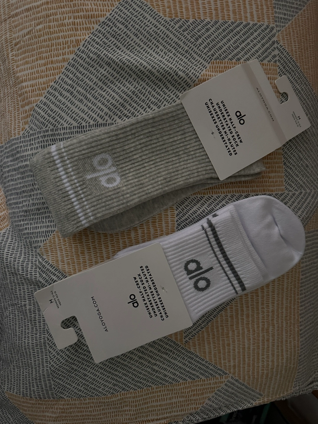 These Alo Yoga unisex half-crew socks are in great condition and new. They're a size M and come in a neutral grey and white colour, perfect for everyday wear. The socks are understated and comfortable. It is for 1 pair and I have 2 pairs