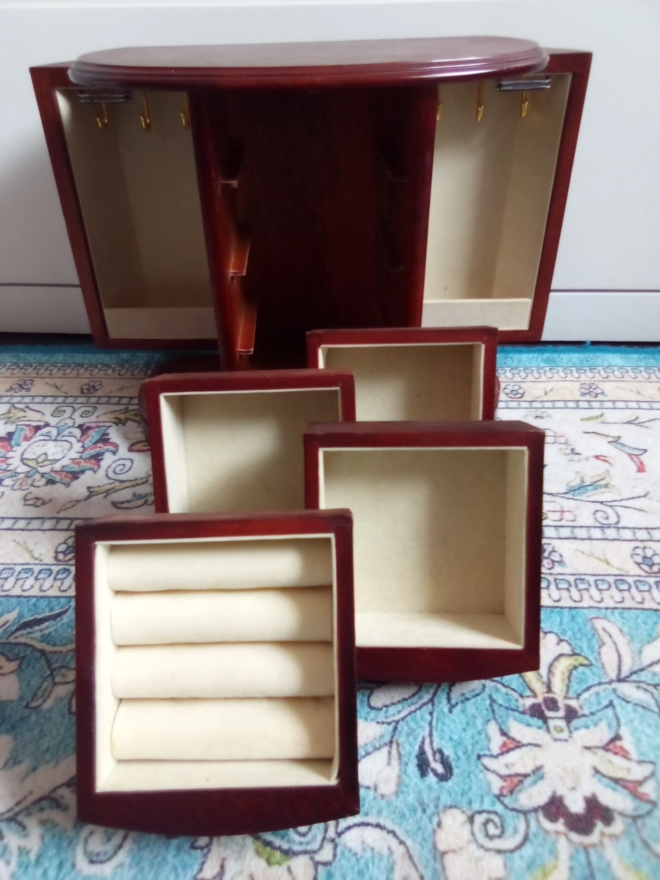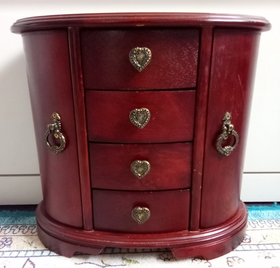 Selling a lovely wooden jewelry box with multiple drawers. It's perfect for keeping your jewellery organized and safe. The box is in great condition and has a beautiful, classic design. It features heart-shaped drawer pulls and side handles. It's a great addition to any dresser or vanity!