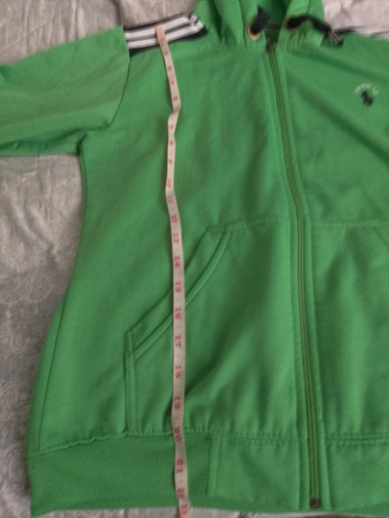 Here's a green full zip hoodie, perfect for layering! It has a sporty look with stripes on the shoulders and a small logo on the chest. The hoodie features pockets and a comfortable fit. It comes with pants. There are some boblins if it doesnβt bother. But it's still in a usable comdition. The size isnβt mentioned there but I took photos with measurements from both the hoodie and the pants set. I know it might not be the right time to upload as it's summer now but you can still keep it when it starts to get cooler! π π I'm giving it away as my mom no longer wants it.
