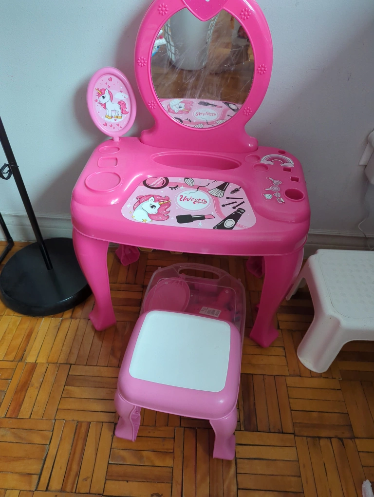 A cute pink vanity table and chair set for kids! It features a unicorn design and includes a mirror. Perfect for pretend play and getting ready in style