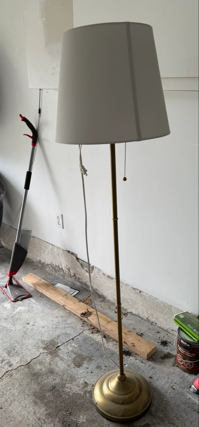 Selling a floor lamp with a beige shade. It has a brass-coloured base and a pull-chain switch. It would be a great addition to any room!