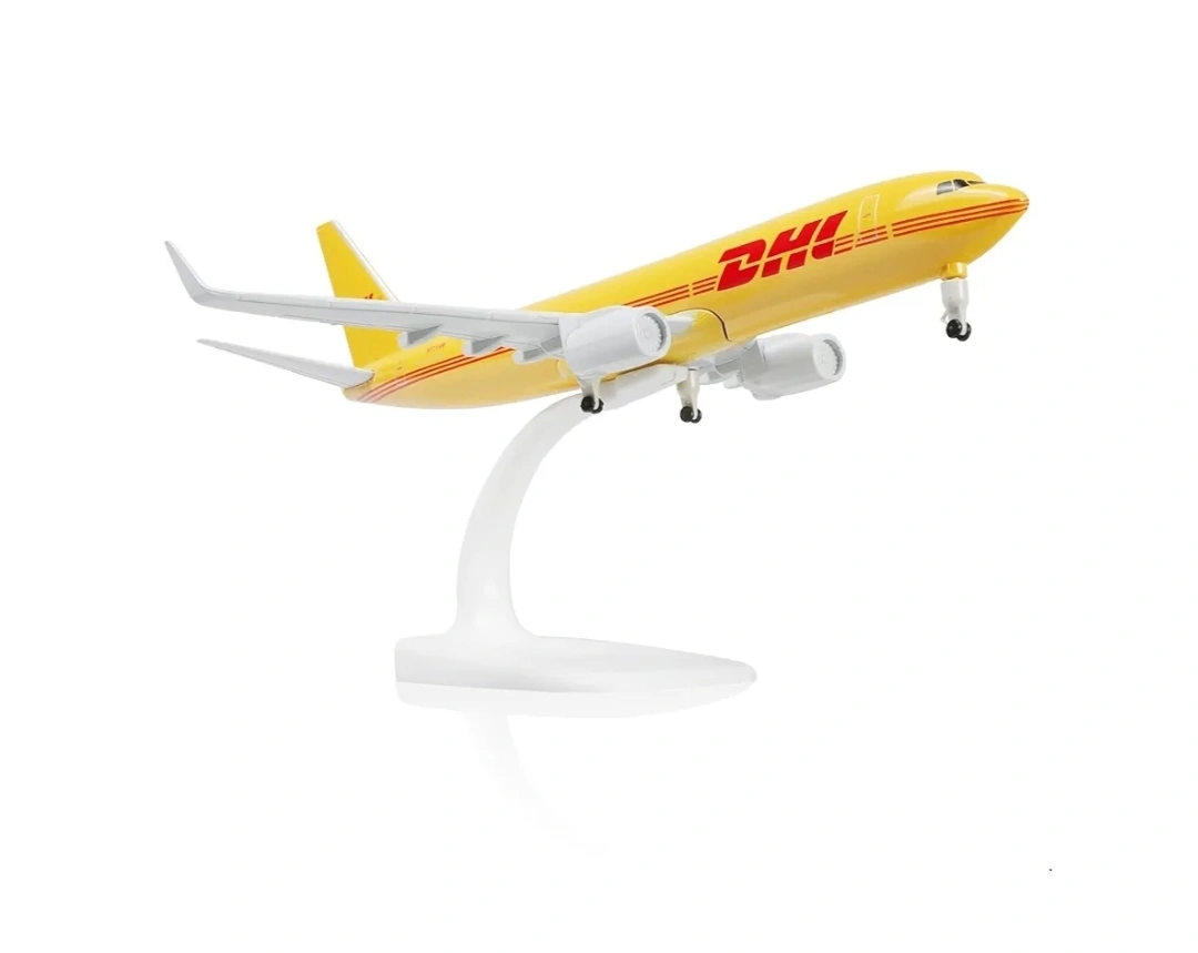 Selling a DHL Boeing 737-800 airplane model. It's in great condition and would be perfect for collectors or aviation enthusiasts. The dimensions are approximately 21 cm (L) x 17.8 cm (W) x 6.5 cm (H).