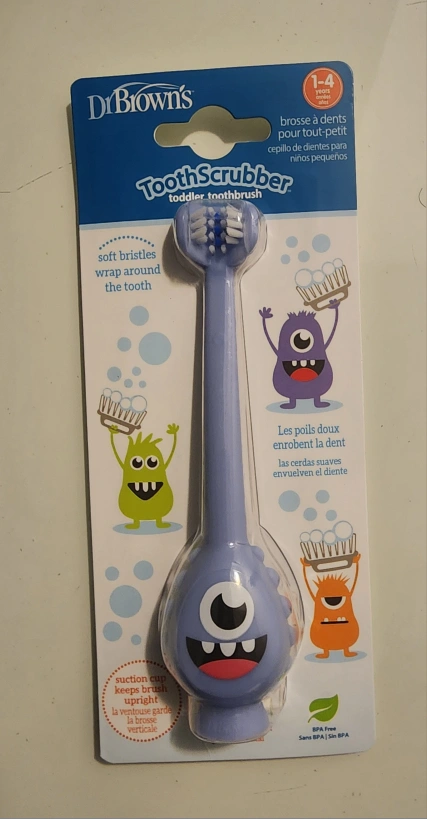 Brand new Dr. Brown's Toothscrubber toddler toothbrush, perfect for little ones aged 1-4 years! It has soft bristles that wrap around the tooth, and a suction cup to keep the brush upright. BPA free too!