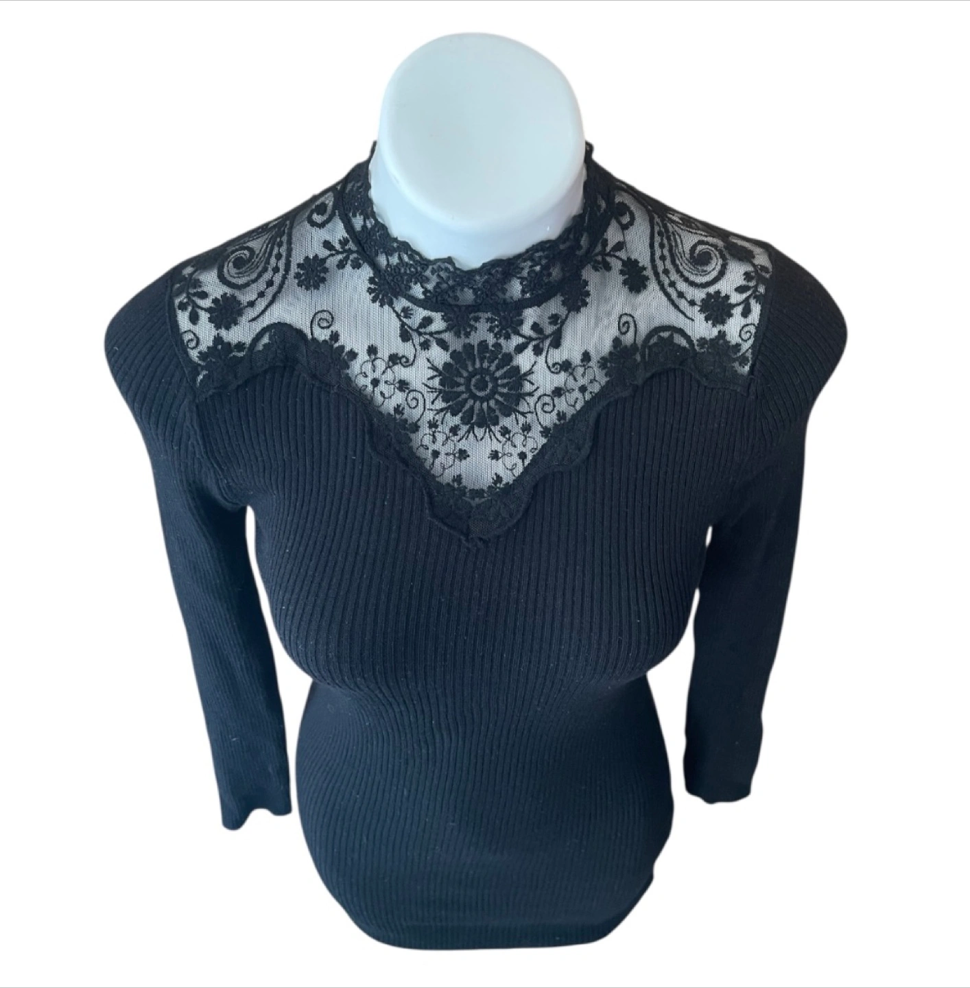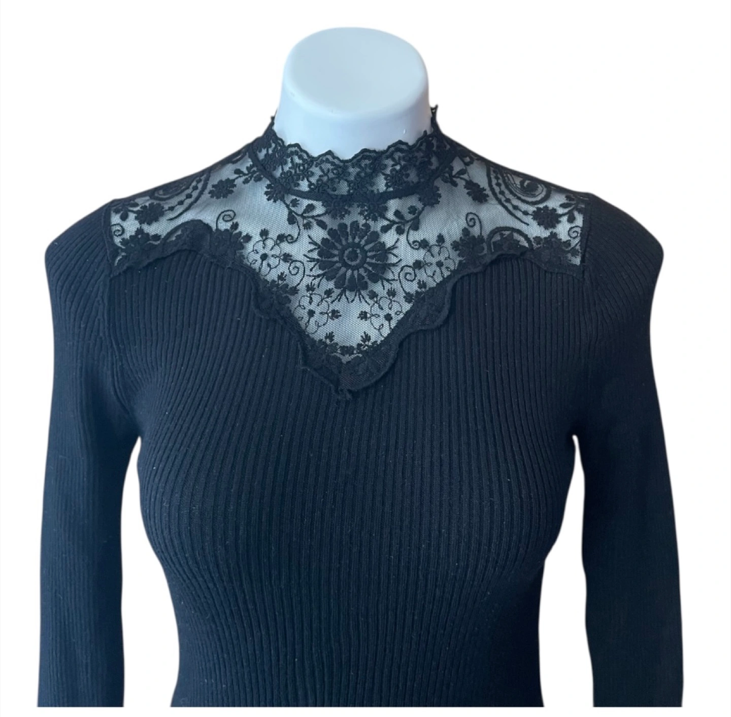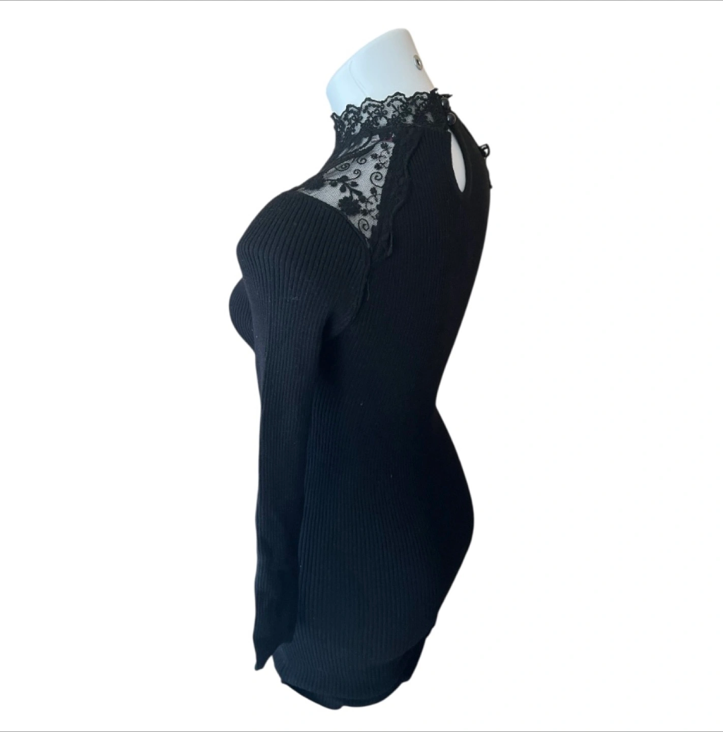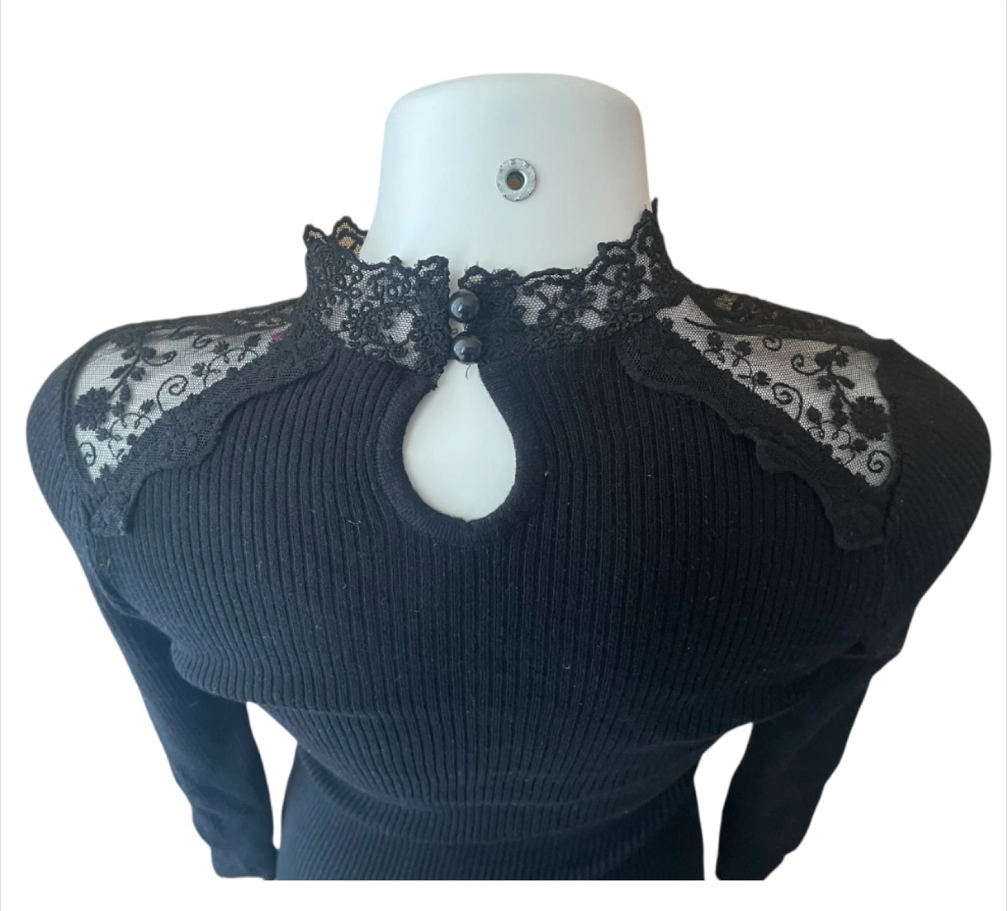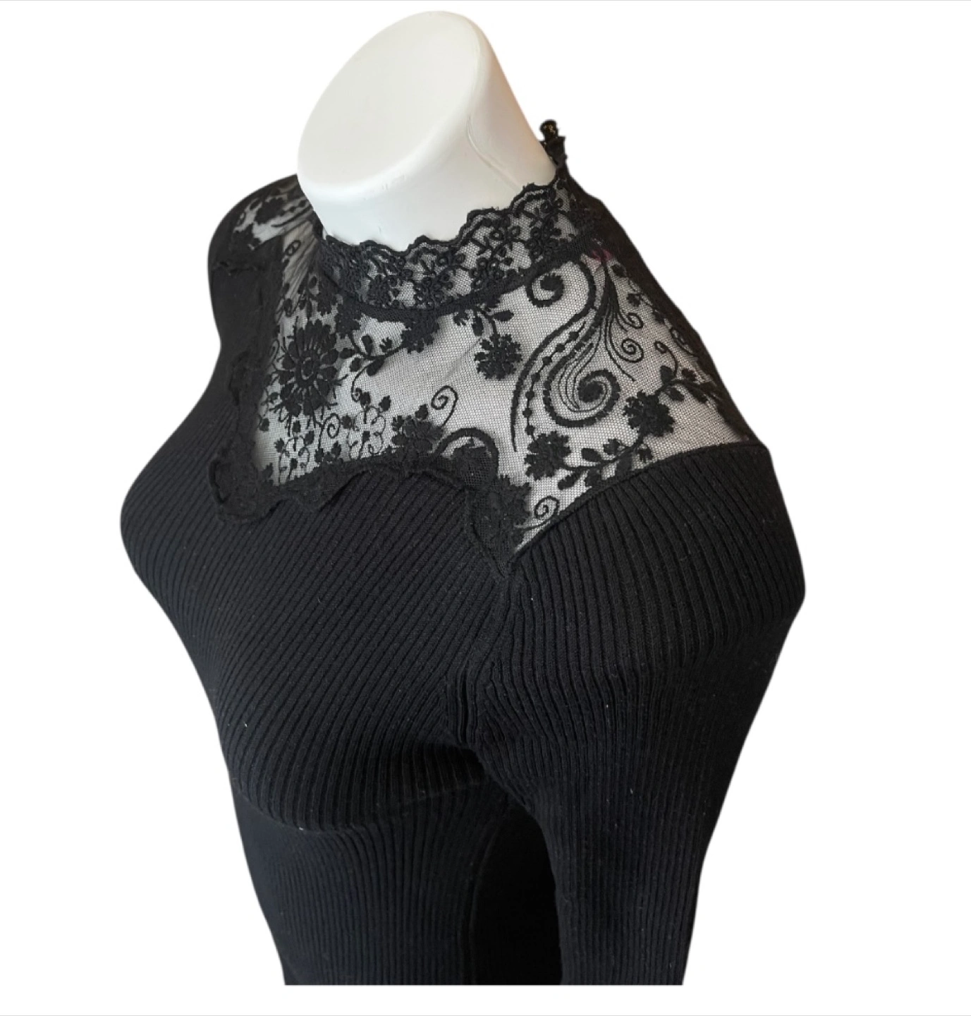 NWOT Vintage 2000s Y2K Black Lace Mock Neck Sweater Ribbing Long Sleeves S/M Condition: 10/10. No Stains/Rips/Tears. ๐ RARE FIND! โ CERTIFIED AUTHENTIC VINTAGE 2000s ITEM & Y2K STYLE Measurements (Inches): **Mannequin is overall size medium **Clothing measured on flat surface - ONLY LEFT TO RIGHT - NOT ALL AROUND CIRCUMFERENCE Tag Size: Shoulder to shoulder: 17 Bust: 19 Waist: 16 Hips: 19 Sleeve Length: 22 Armpit Width: 9 Length from shoulder to bottom hem: 27 Style Details: Authentic Y2K - gothic style Minimalist design - ribbing texture & lace on the neck & collarbone area Heart shape neckline design Mock neck turtleneck Bodycon fit - complimentary Color: black Stretch to the material & super soft Long sleeves Long length fit (past the hips area) Material: 92% Viskon/ 8% Elit Closure: pullover and two buttons at the back of the mock neck area