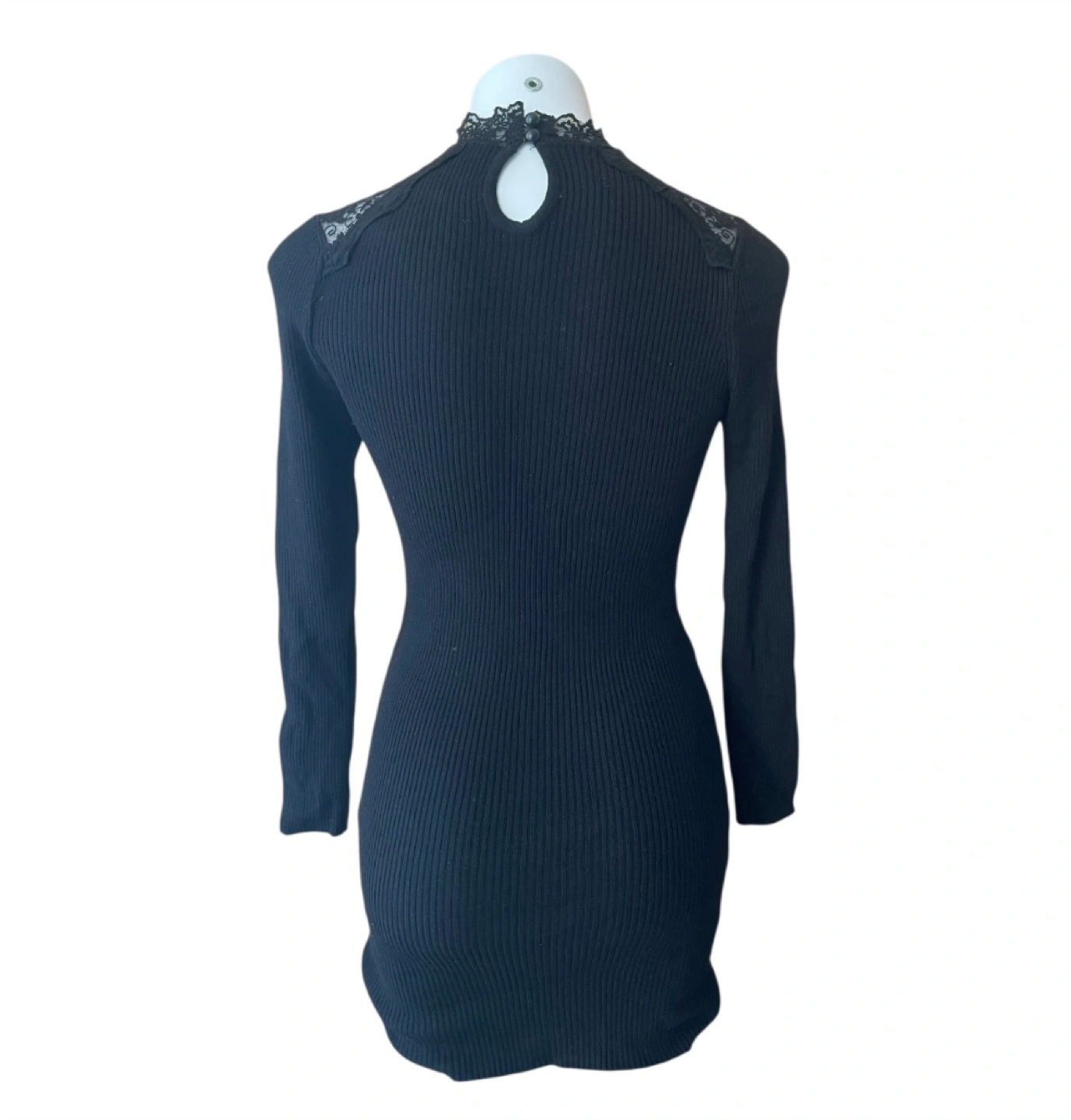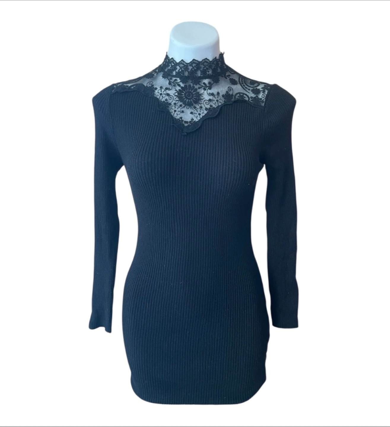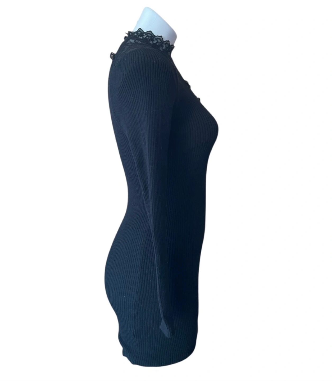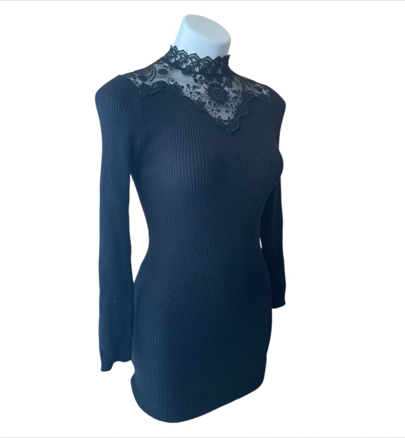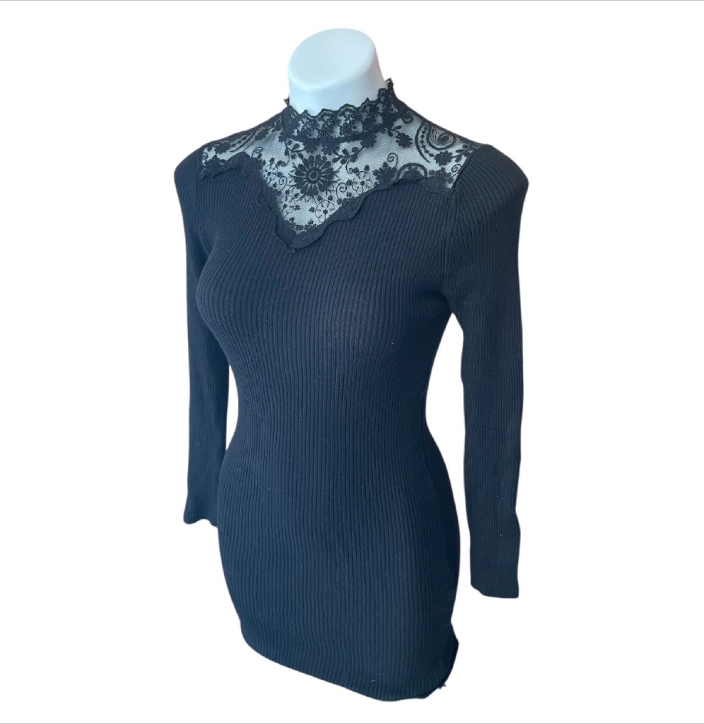NWOT Vintage 2000s Y2K Black Lace Mock Neck Sweater Ribbing Long Sleeves S/M Condition: 10/10. No Stains/Rips/Tears. ๐ RARE FIND! โ CERTIFIED AUTHENTIC VINTAGE 2000s ITEM & Y2K STYLE Measurements (Inches): **Mannequin is overall size medium **Clothing measured on flat surface - ONLY LEFT TO RIGHT - NOT ALL AROUND CIRCUMFERENCE Tag Size: Shoulder to shoulder: 17 Bust: 19 Waist: 16 Hips: 19 Sleeve Length: 22 Armpit Width: 9 Length from shoulder to bottom hem: 27 Style Details: Authentic Y2K - gothic style Minimalist design - ribbing texture & lace on the neck & collarbone area Heart shape neckline design Mock neck turtleneck Bodycon fit - complimentary Color: black Stretch to the material & super soft Long sleeves Long length fit (past the hips area) Material: 92% Viskon/ 8% Elit Closure: pullover and two buttons at the back of the mock neck area