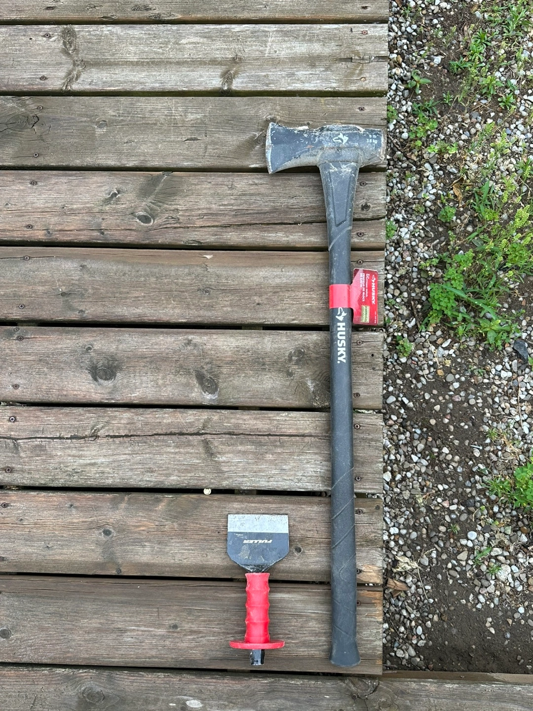 This is a used Husky 8 lb. sledge hammer, perfect for demolition work, driving stakes, or breaking up concrete, featuring a durable construction and a comfortable grip. Also included is a Fuller brick chisel. Please note it has signs of wear but is still very functional, ready for your next project! * **Type:** Sledge Hammer * **Weight:** 8 lb. * **Brand:** Husky