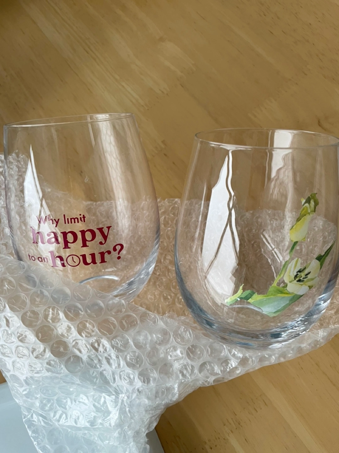 Selling a set of two stemless wine glasses. One glass has the phrase 'Why limit happy to an hour?' printed on it, and the other has a floral design