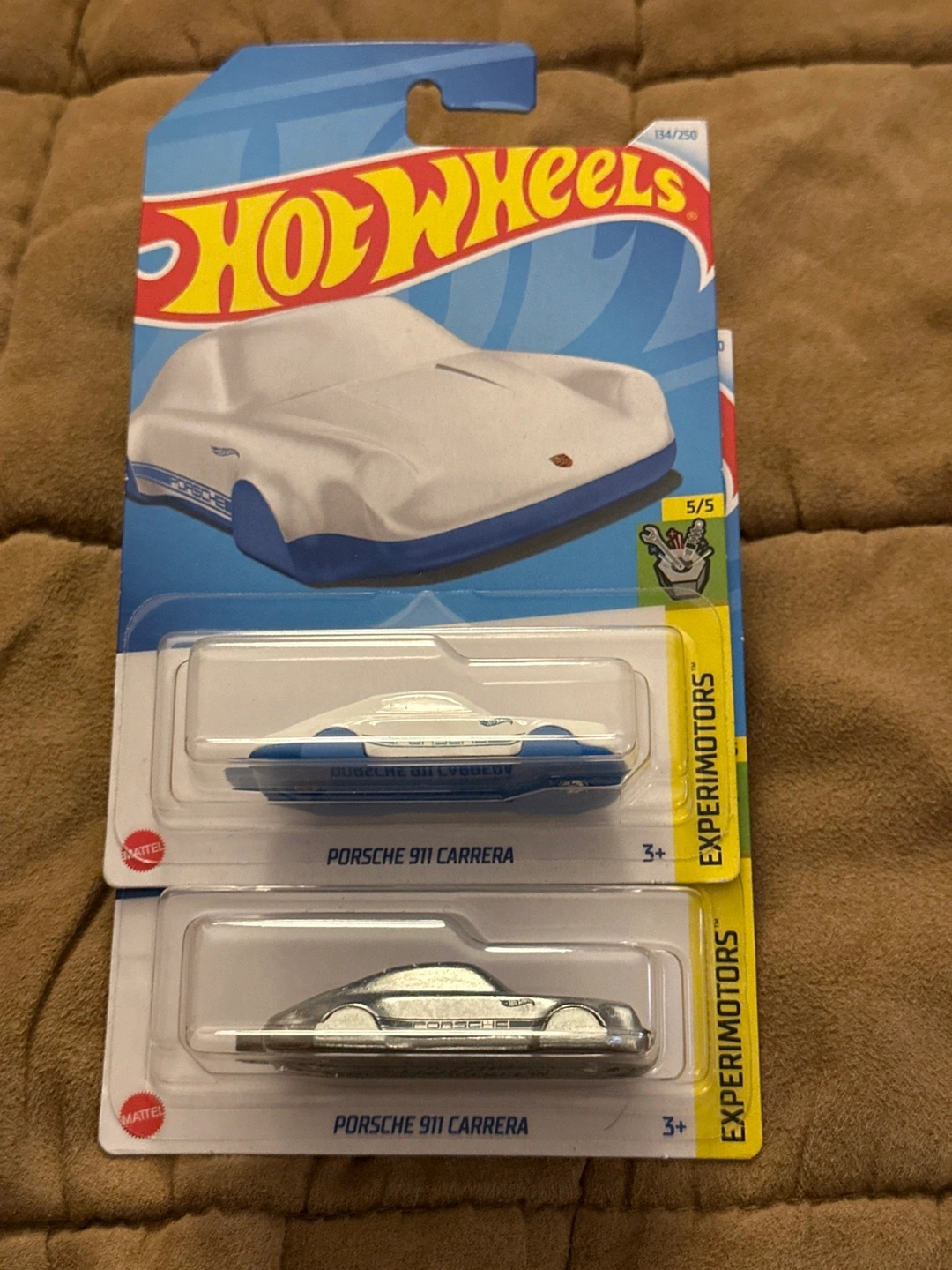 Selling two Hot Wheels Porsche 911 Carrera cars. One is silver and the other is white and blue. Both are in their original packaging and are in great condition!