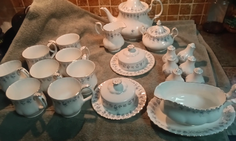 Collection of Royal Albert "Memory Lane " Would like to sell it as a Bundle Asking $220.00 an incredible Price Everything is in Like New Condition Included are: 1 x Teapot 1 x Covered Sugar Dish 1 x Large Creamer 2 x Butter Dish and Lids 3 x Salt and Pepper Shakers Sets 1 x Gravy Boat and Underdish 8 x Coffee/ Cocoa Mugs Please Pickup Clarkson Area Mississauga or I offer Delivery Willing to Ship at Buyers Expense Please take time to view my other Ads for more China Sets and Collectibles