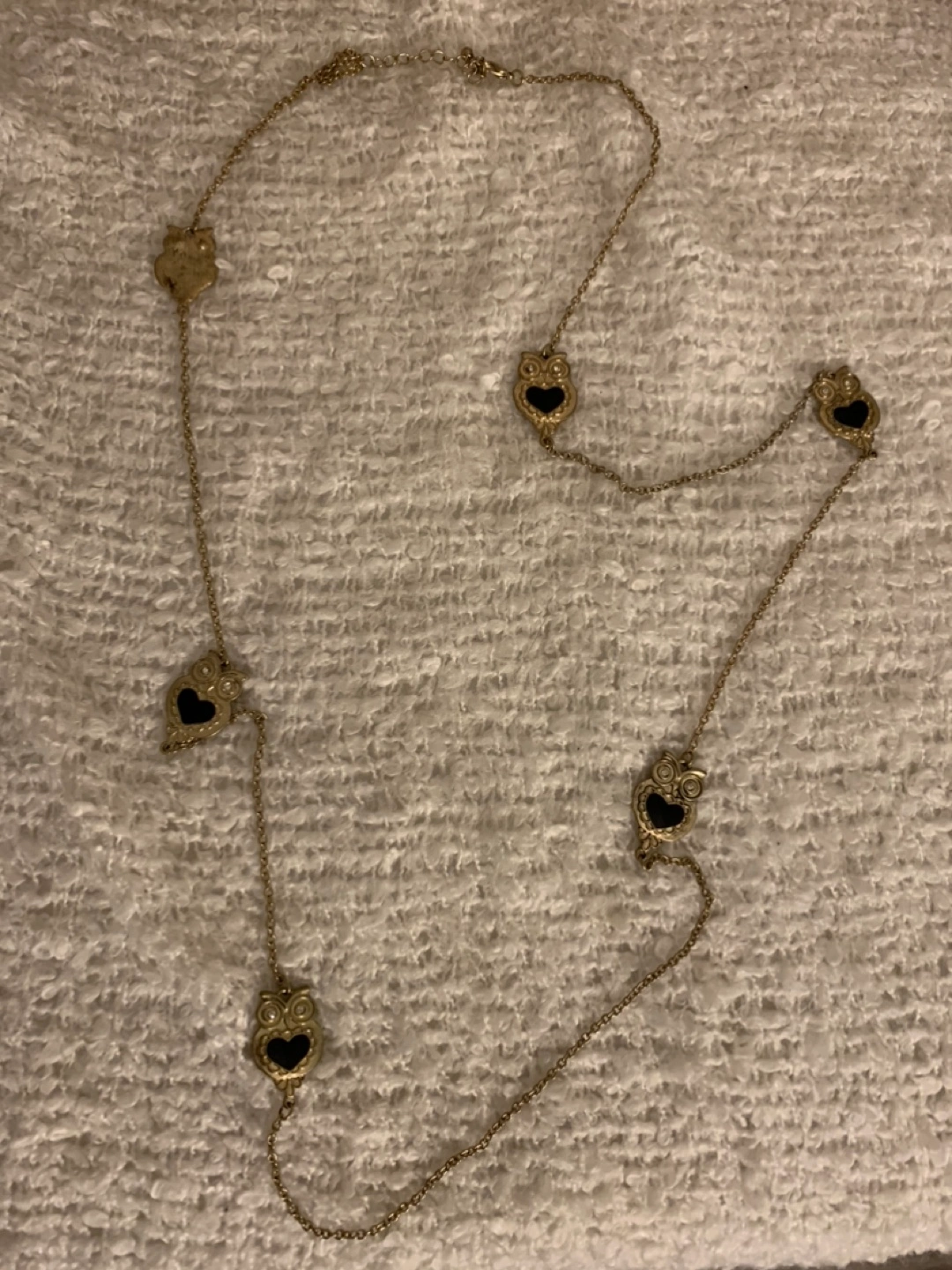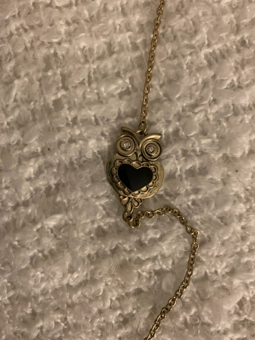 Cute gold-tone necklace featuring owl and heart charms. It’s a ver long chain, goes past the chest. Pick up near Spadina Ave & Front St W
