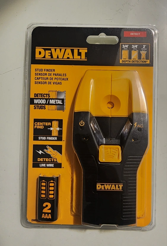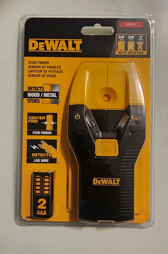 Selling a brand new DeWalt stud finder! It detects wood, metal studs, and live wires. It also has depth detection for 3/4", 3/2", and 2".