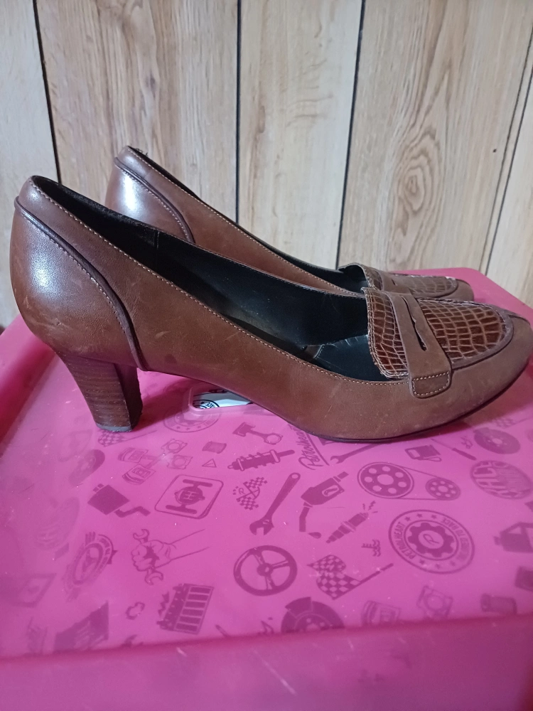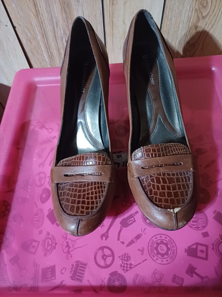 'Naturalizer' brown leather heels in size 8. They feature a stylish design with a textured leather accent on the toe.
