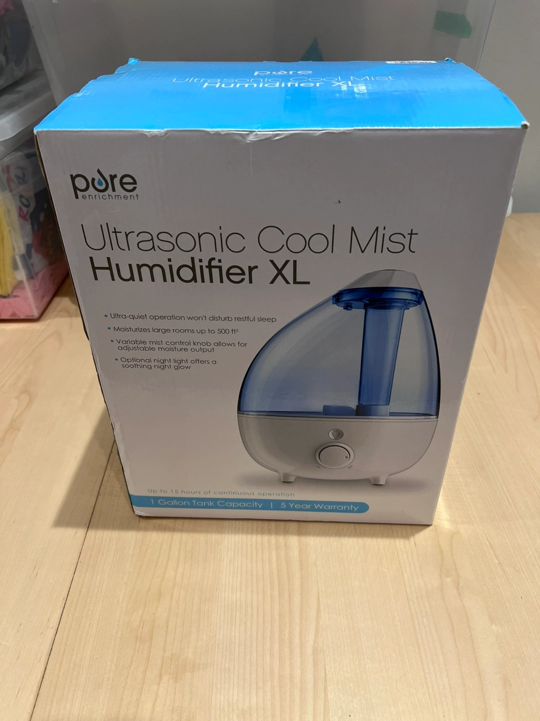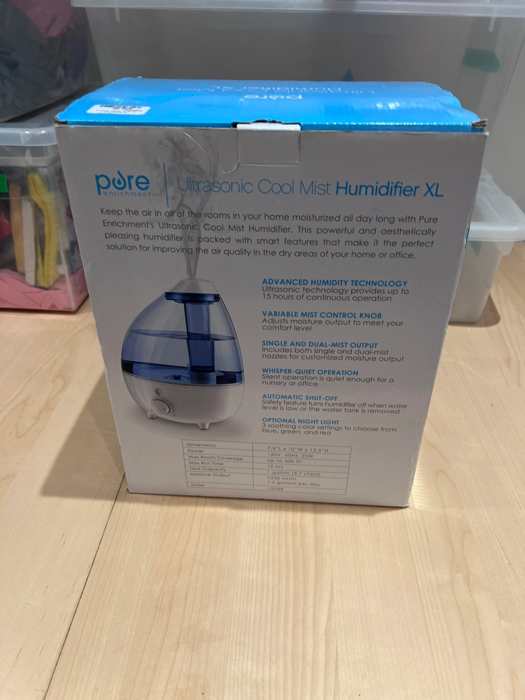 Keep your home moisturized with this Pure Enrichment Ultrasonic Cool Mist Humidifier XL! It's designed to be powerful and aesthetically pleasing, packed with smart features for optimal air quality. Key features include: - Advanced humidity technology for up to 15 hours of continuous operation - Variable mist control knob - Single and dual-mist output - Whisper-quiet operation, perfect for nurseries or offices - Automatic shut-off when the water tank is removed - Optional night light with soothing colour settings It also has a 1-gallon tank capacity and a 5-year warranty
