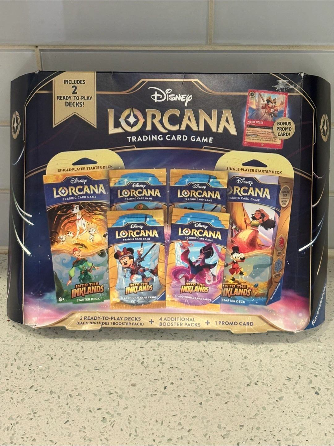 Selling a Disney Lorcana Trading Card Game set, Into the Inklands edition! It includes 2 ready-to-play decks and 4 additional booster packs. Plus, there's a bonus promo card included, a 'Glimmer Foil' Mickey Mouse - Pirate Captain promo card! Perfect for getting started or expanding your collection New in unopened package Multiple available