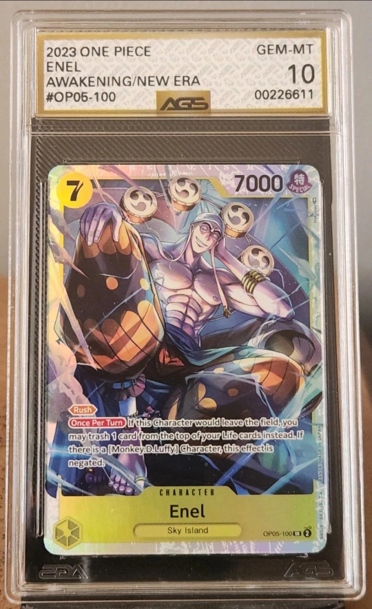 Selling a graded One Piece card featuring Enel from the Awakening/New Era set, OP05-100. This card has received a GEM-MT 10 grade from AGS.