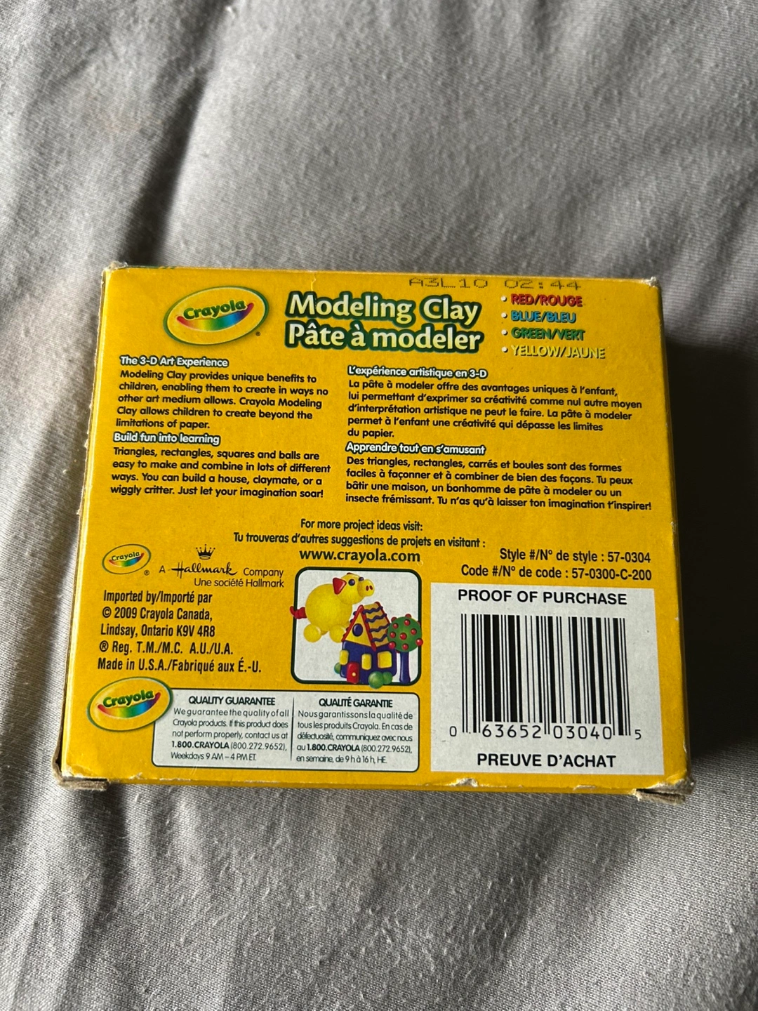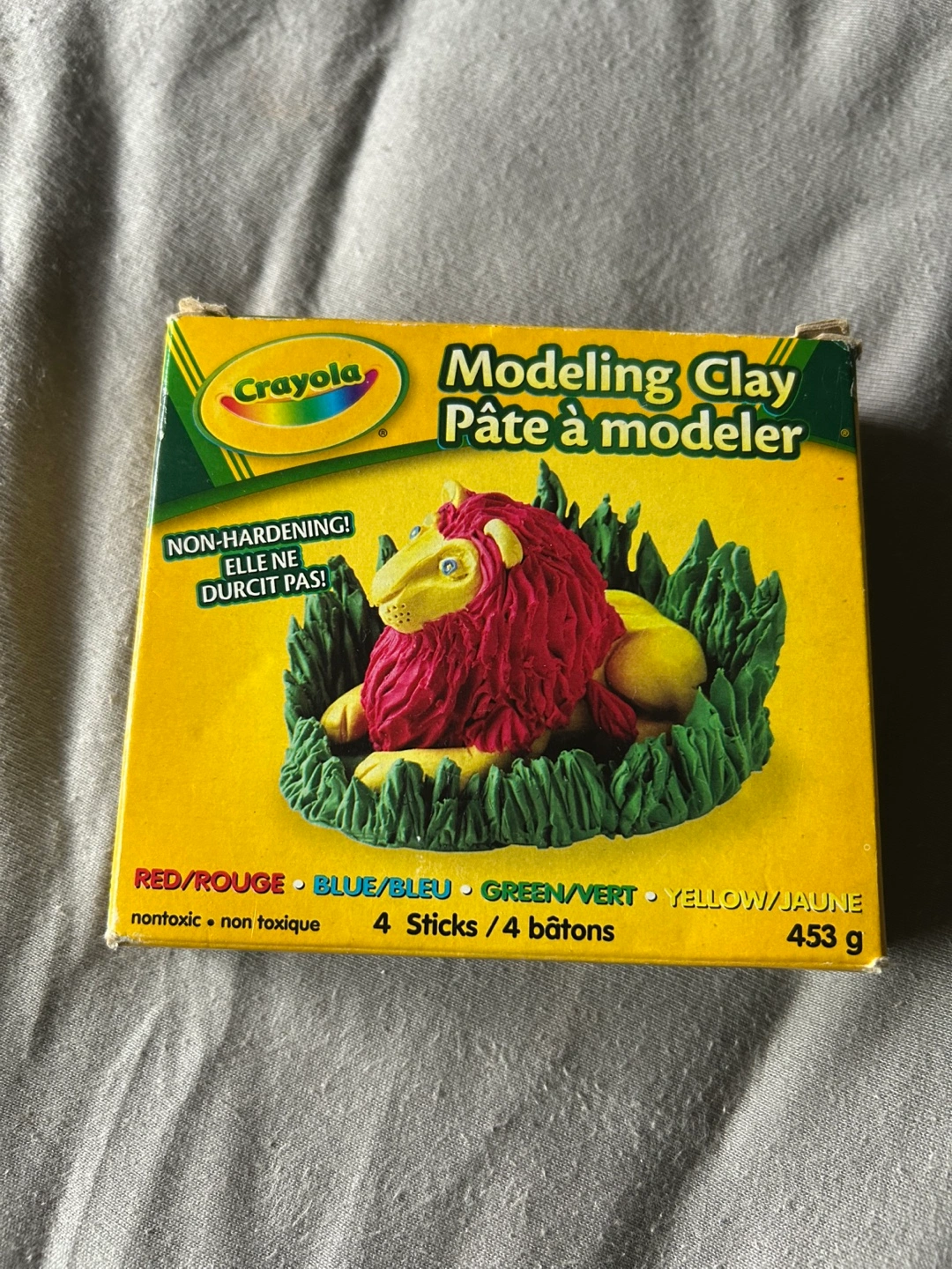 Selling a box of Crayola Modeling Clay! This set includes four different colours: red, blue, green, and yellow. The clay is non-toxic and non-hardening, making it perfect for kids' art projects. Each box contains 453g of clay. Box slightly damaged in corners from storage . Red , blue, and green have a small amount used .