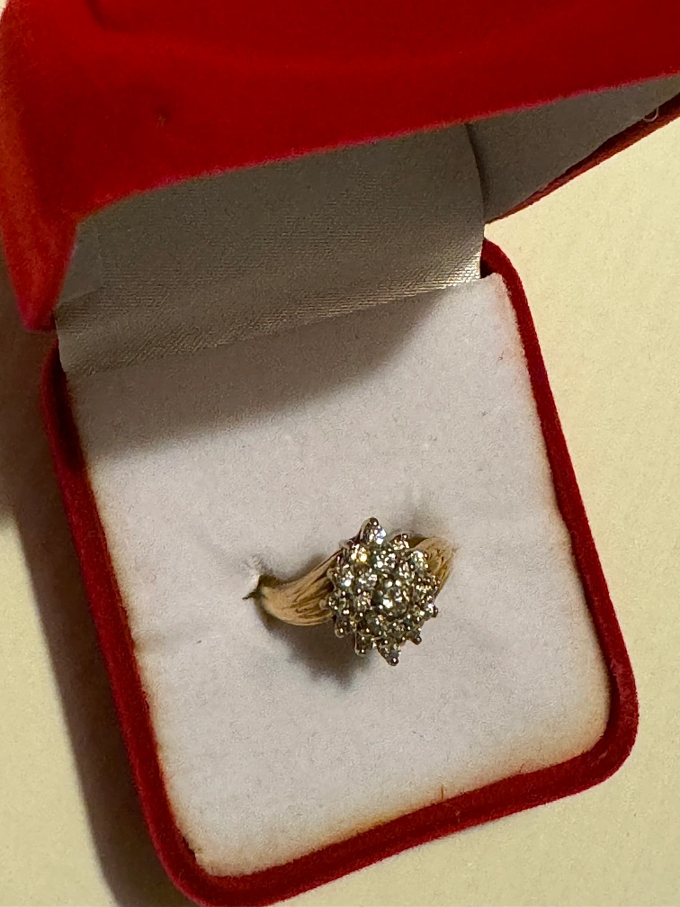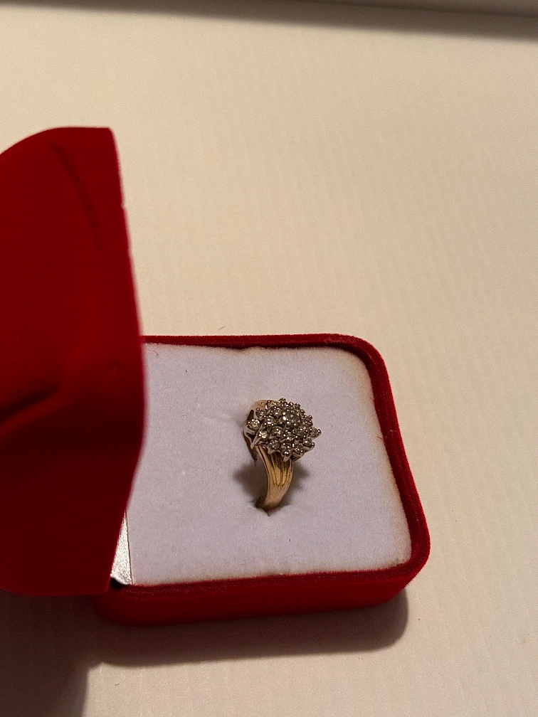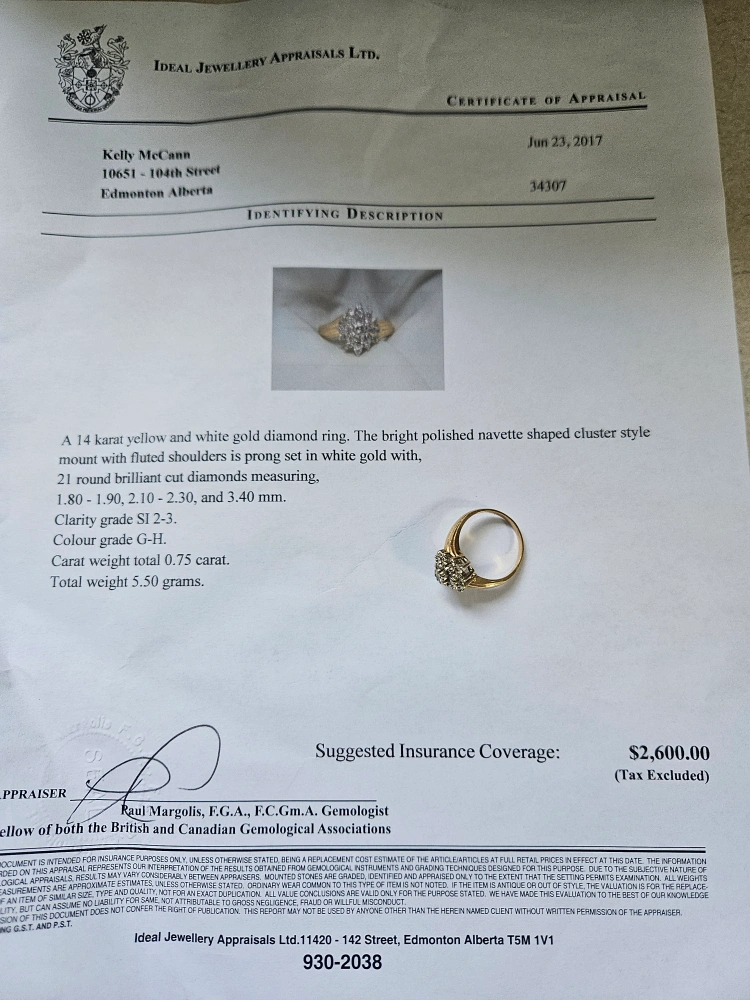 Selling a beautiful 14 karat yellow and white gold diamond ring. The ring features a bright polished navette shaped cluster style mount with fluted shoulders prong set in white gold. It has 21 round brilliant cut diamonds measuring 1.80, 1.90, 2.10 - 2.30, and 3.40 mm. The clarity grade is SI 2-3, and the colour grade is G-H. Carat weight total 0.75 carat. Total weight 5.50 grams.