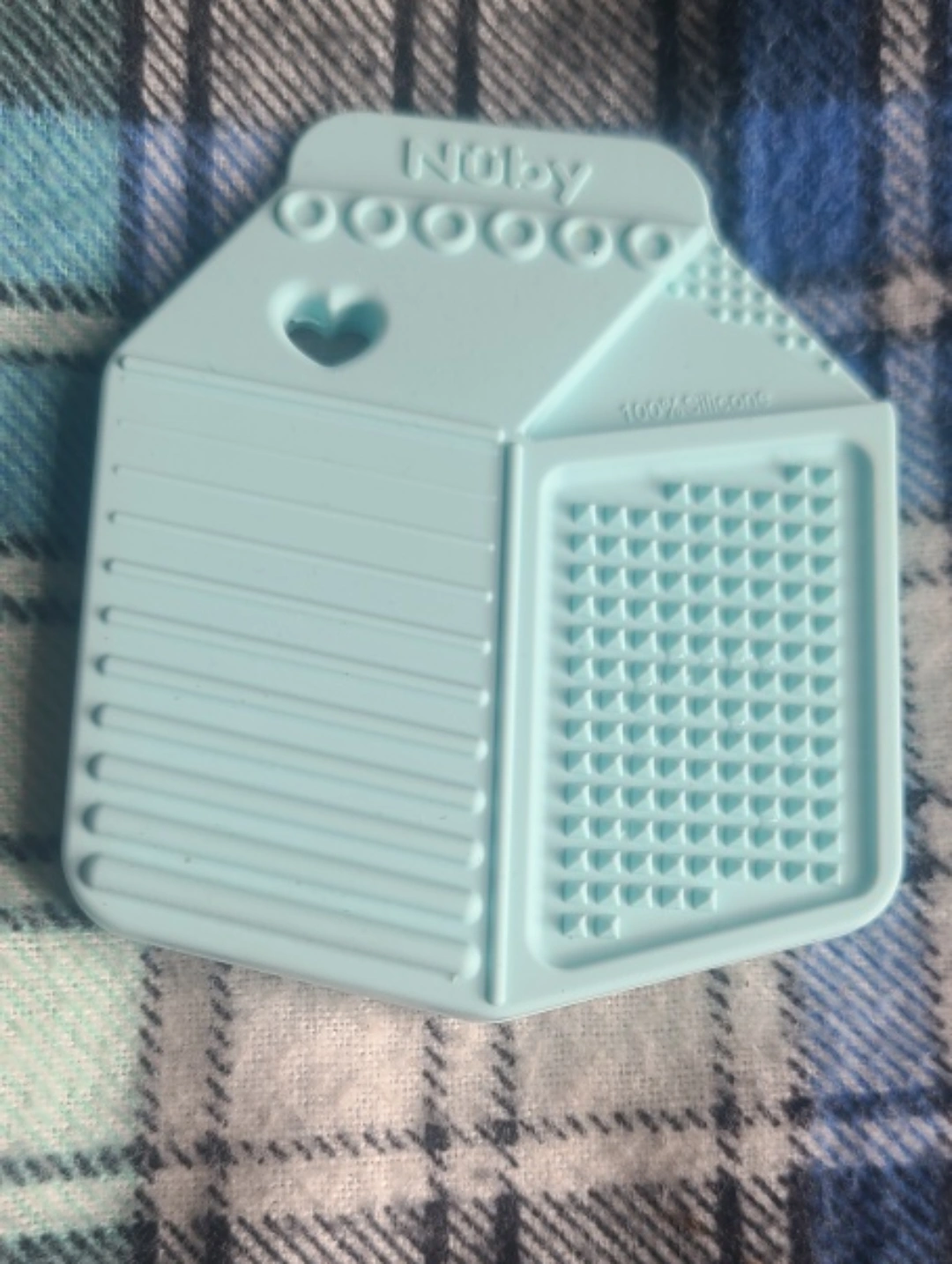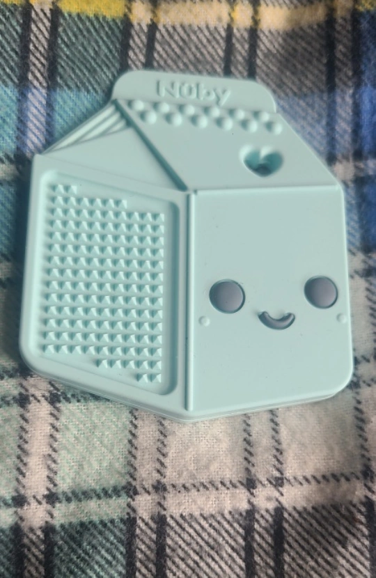 I'm giving away a brand new Nuby silicone teether without the package because my baby never used it and I'd rather give it to someone in need, It's designed with 100% silicone and features multiple teething surfaces to help soothe your little one's gums. The cute milk carton design makes it fun and easy for baby to hold
