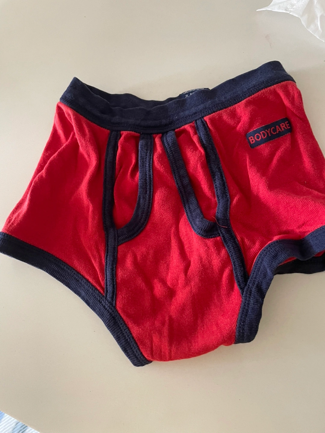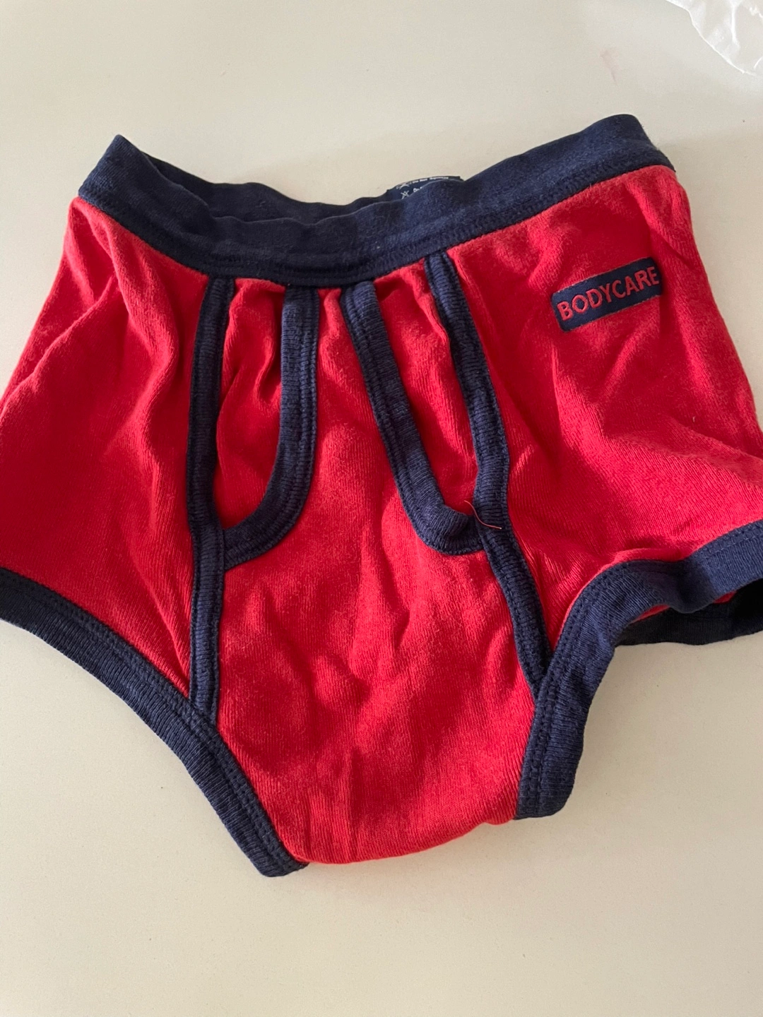 Selling gently used baby underwear from BODYCARE. They are red and navy, and black and green. No size is visible.