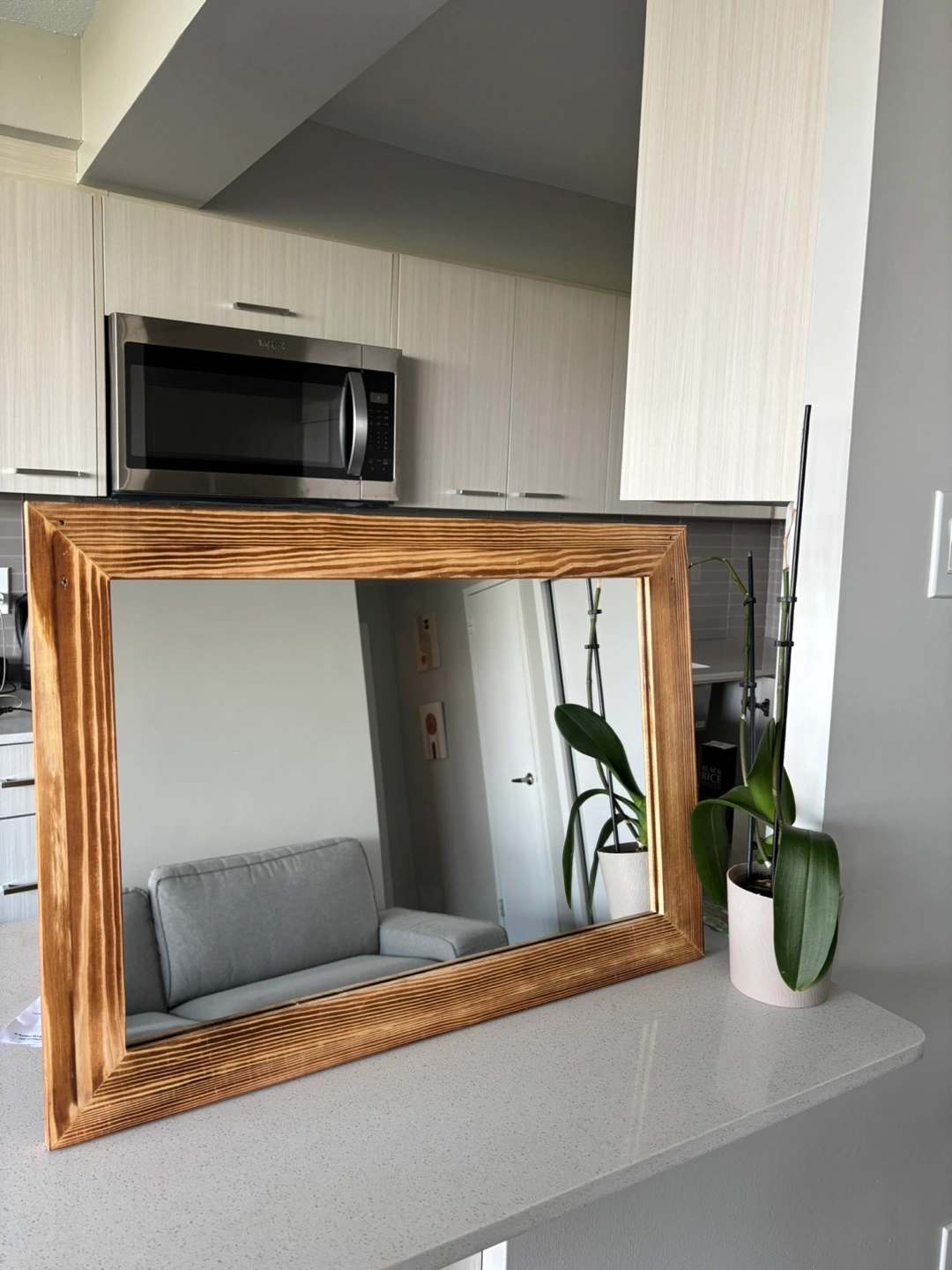 I'm selling a lovely wood-framed mirror that would look great in any home! It features a rustic wood frame and sliding barn door hardware for a unique touch. The dimensions are: - 29.1" wide - 22" high - 0.7" thick