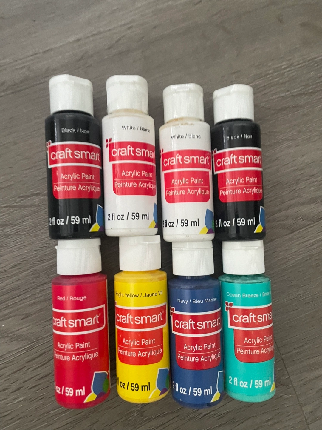 Selling a set of Craft Smart acrylic paints! This set includes 6 different colours, each in a 2 fl oz / 59 ml bottle. They're water-based and dry quickly, perfect for all sorts of craft projects. They adhere well to surfaces like wood, canvas, clay, and more. Easy soap and water cleanup too