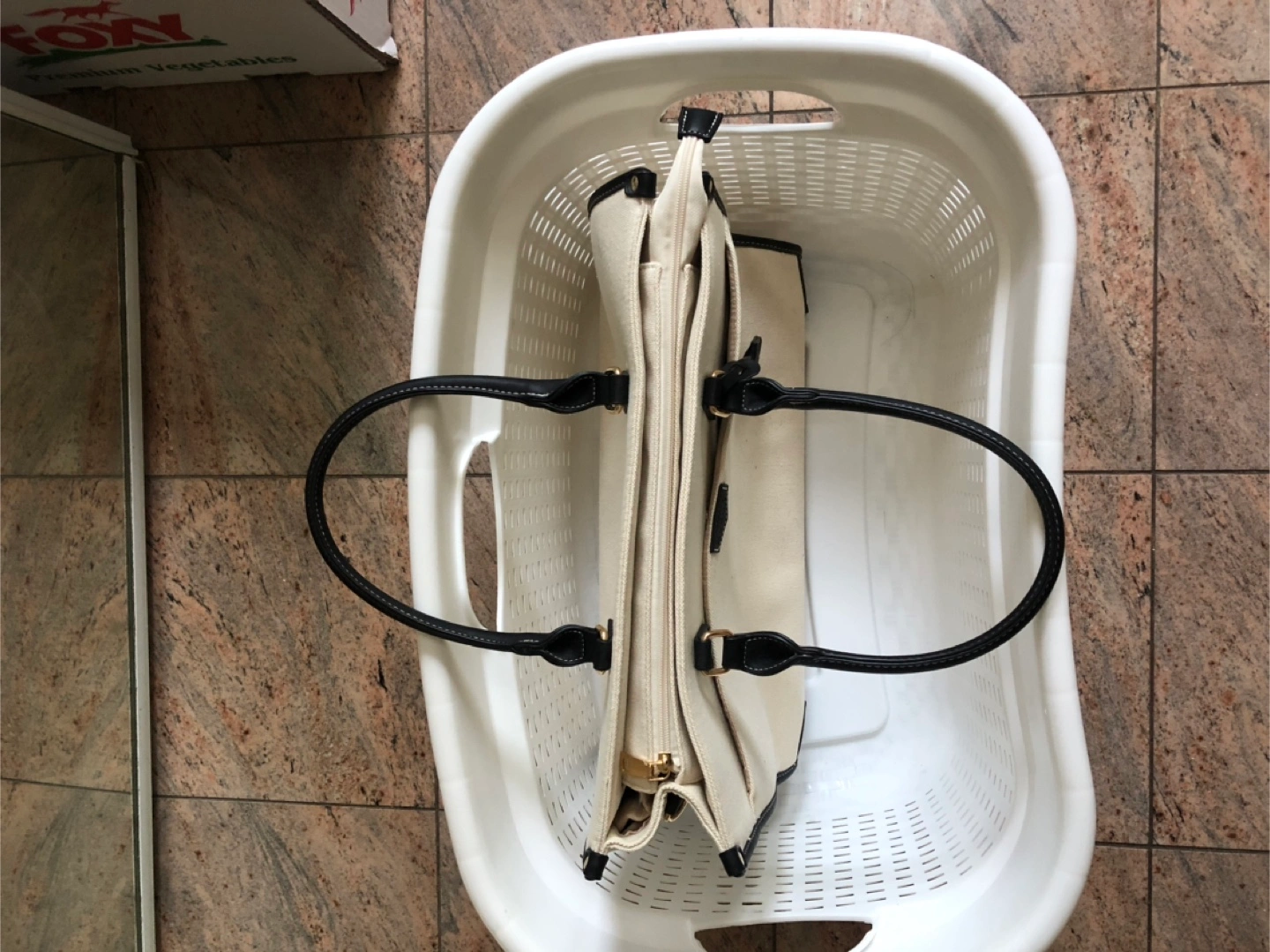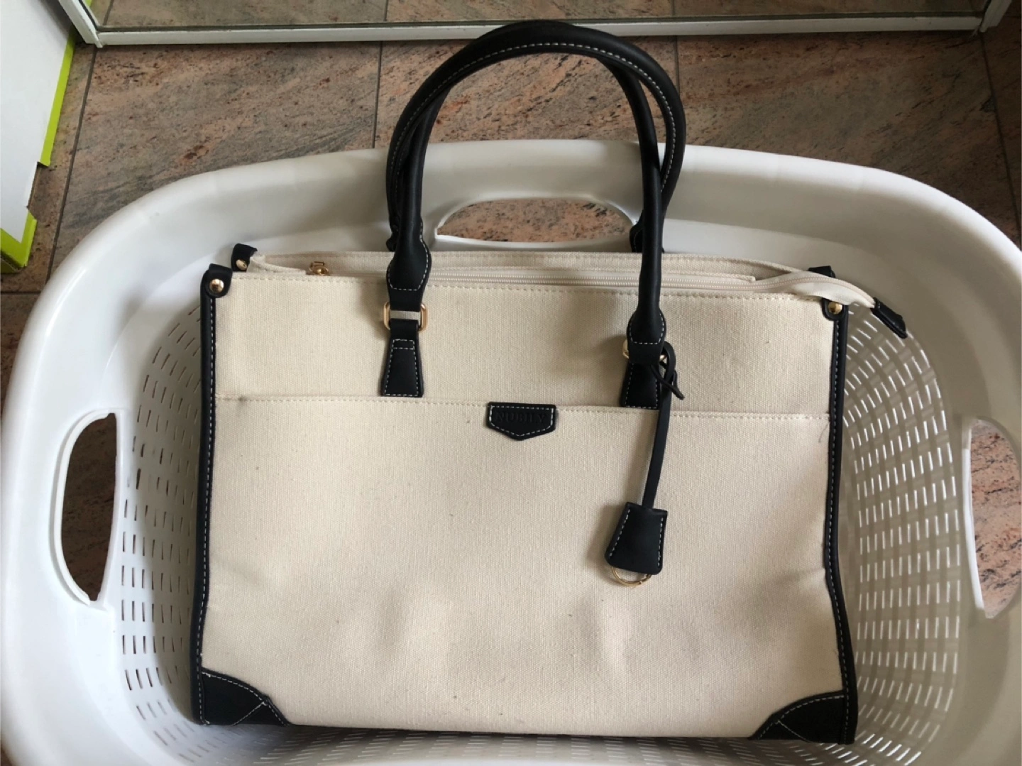 Selling a stylish solid canvas tote bag with black handles. It's new and perfect for everyday commute or business travel. The bag has a beige colour and features a spacious interior with multiple compartments to keep your belongings organized including tablets. It's a versatile and fashionable accessory!