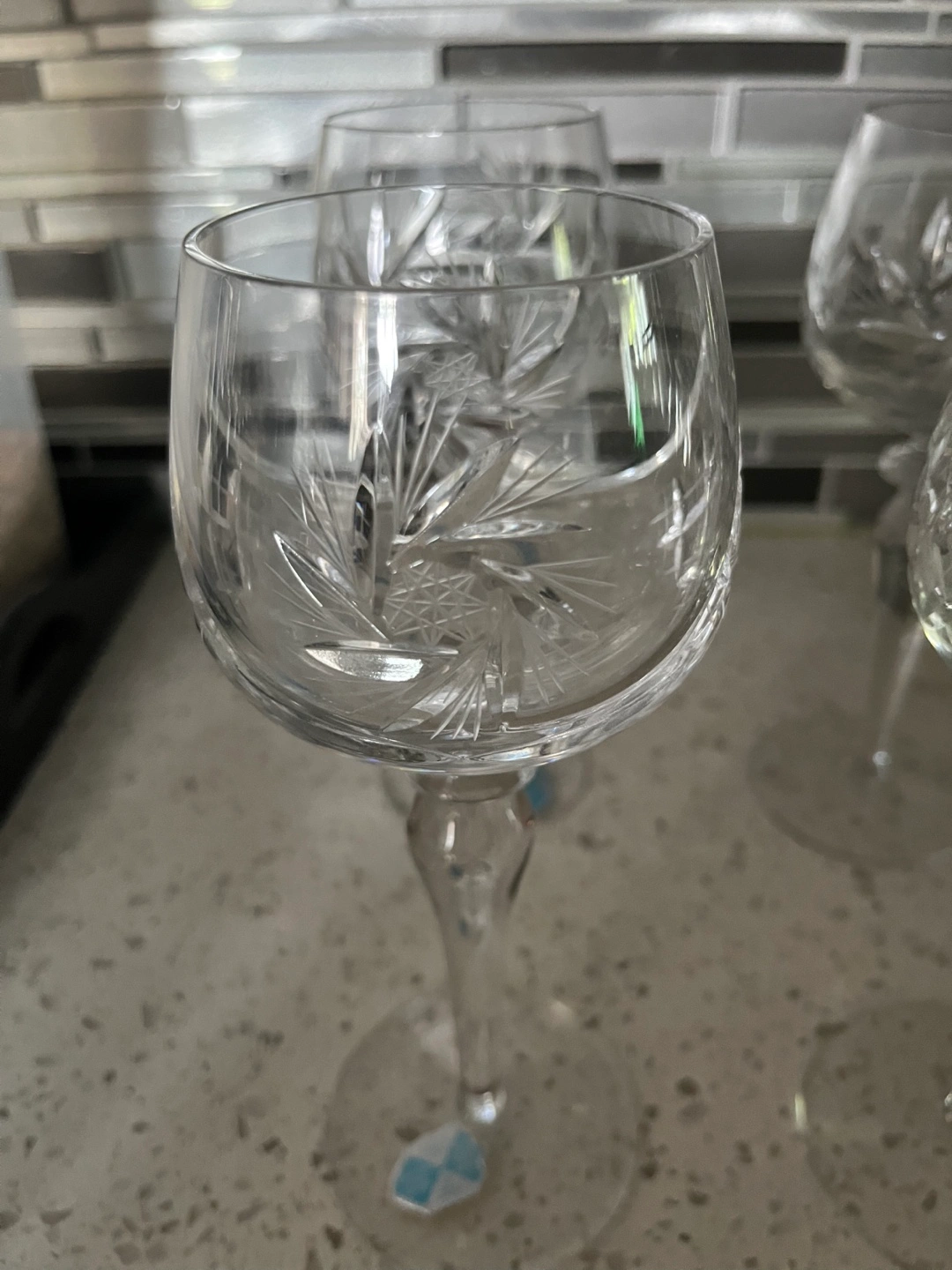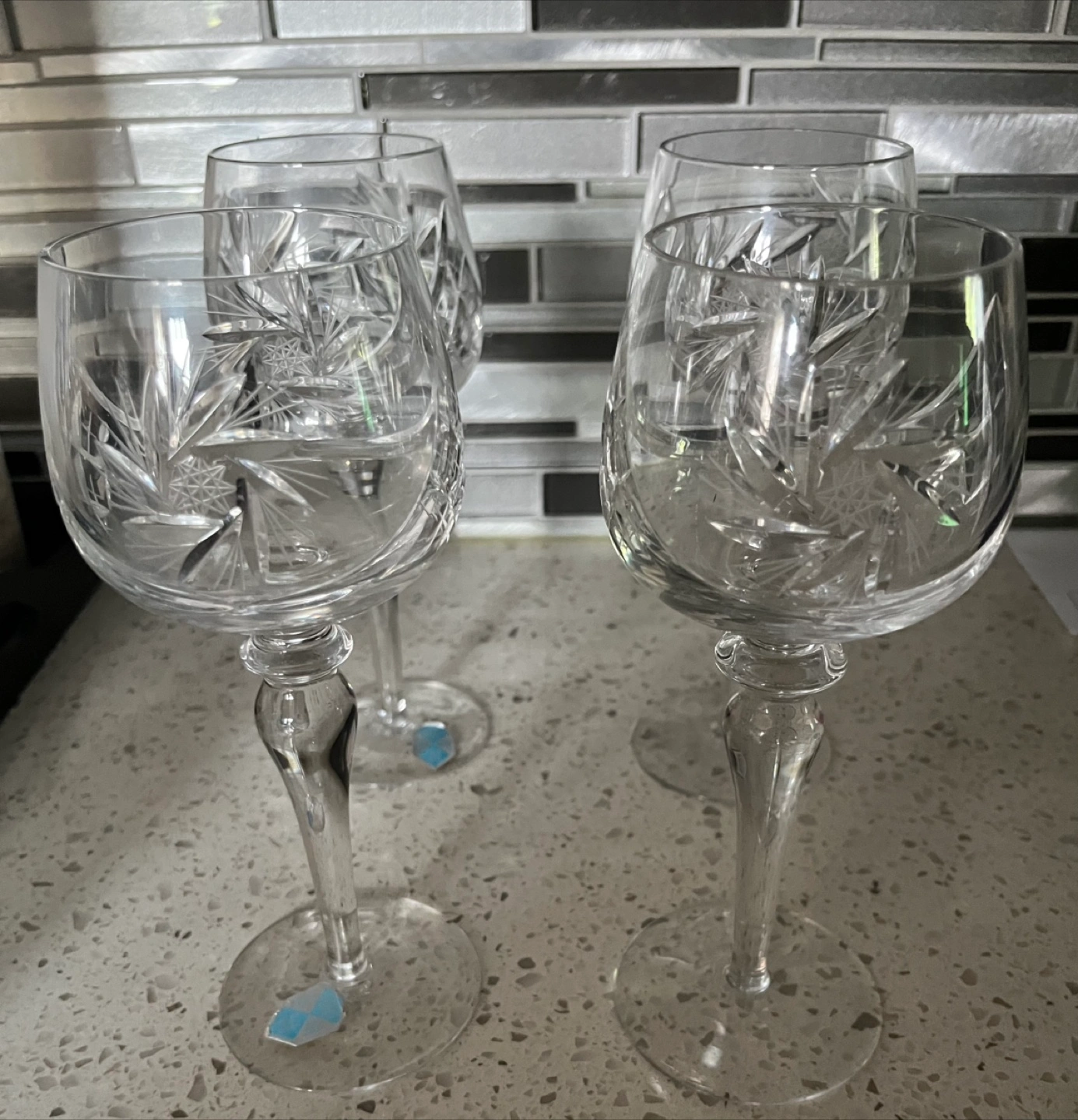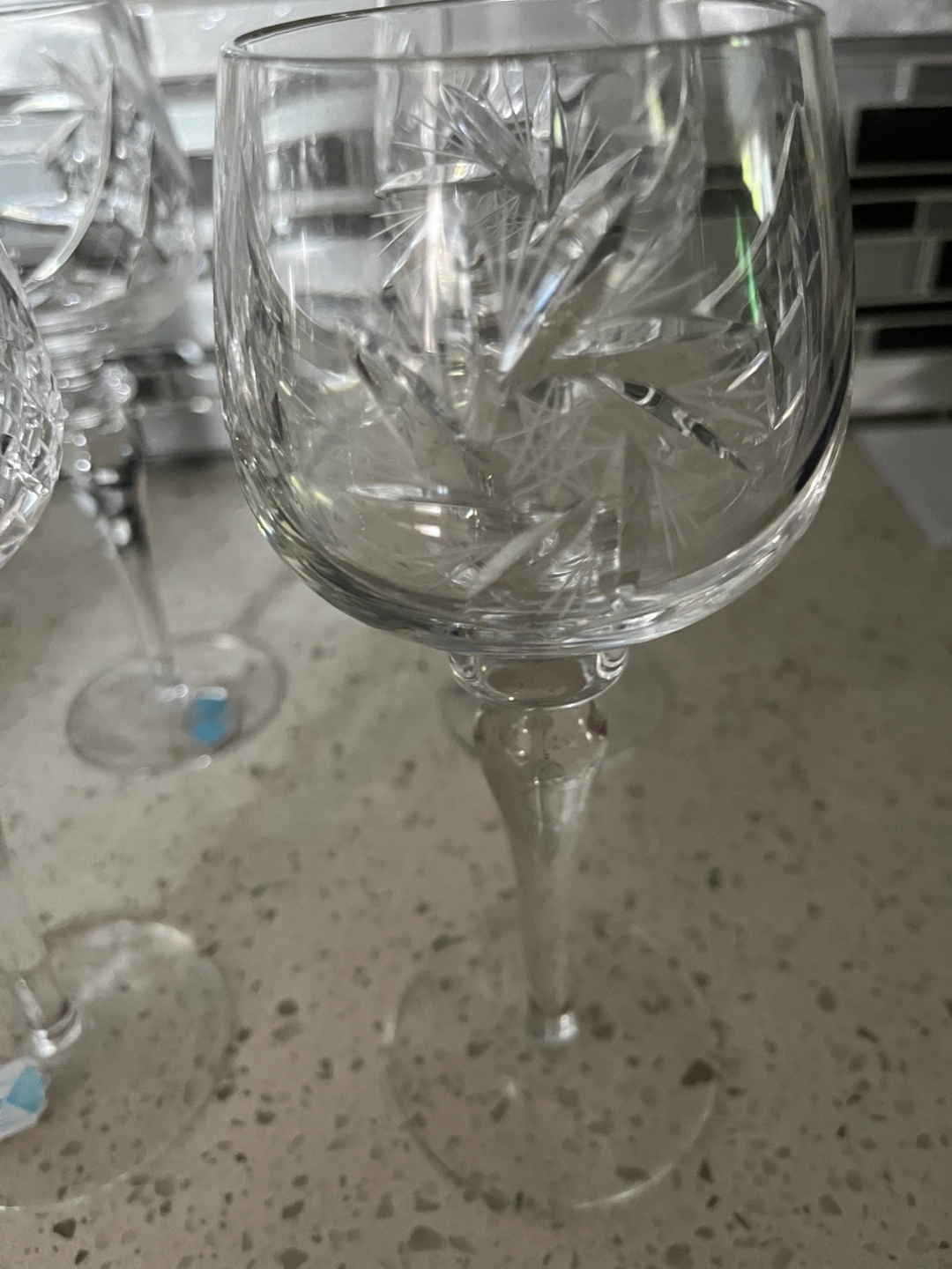 Selling a set of four elegant crystal wine glasses! They feature a beautiful starburst pattern and a slender stem, perfect for adding a touch of sophistication to any occasion. They're in great condition and ready to be enjoyed