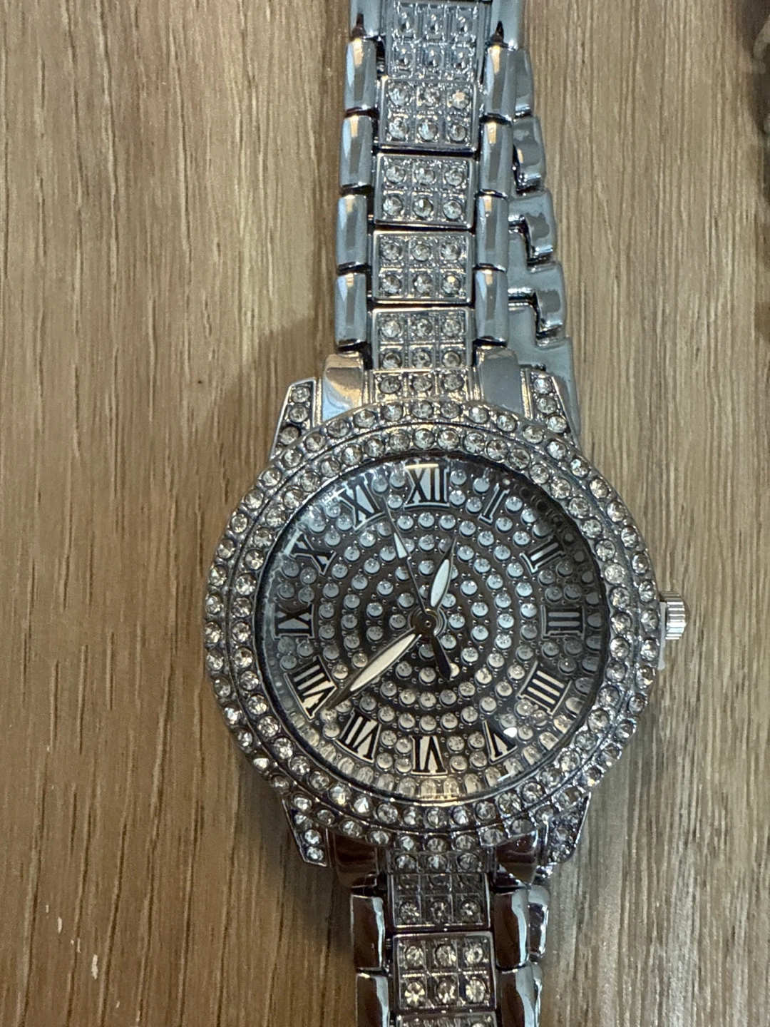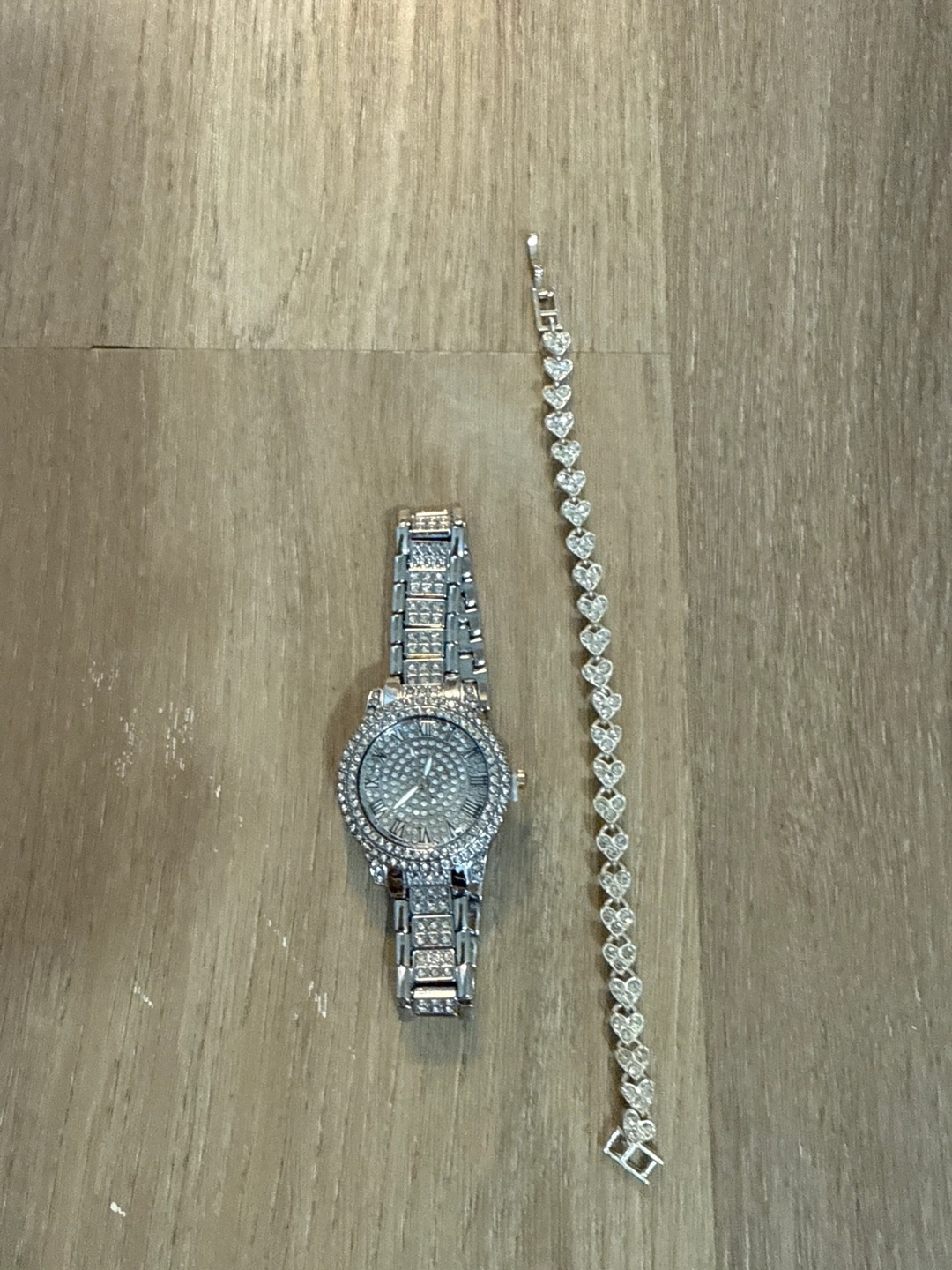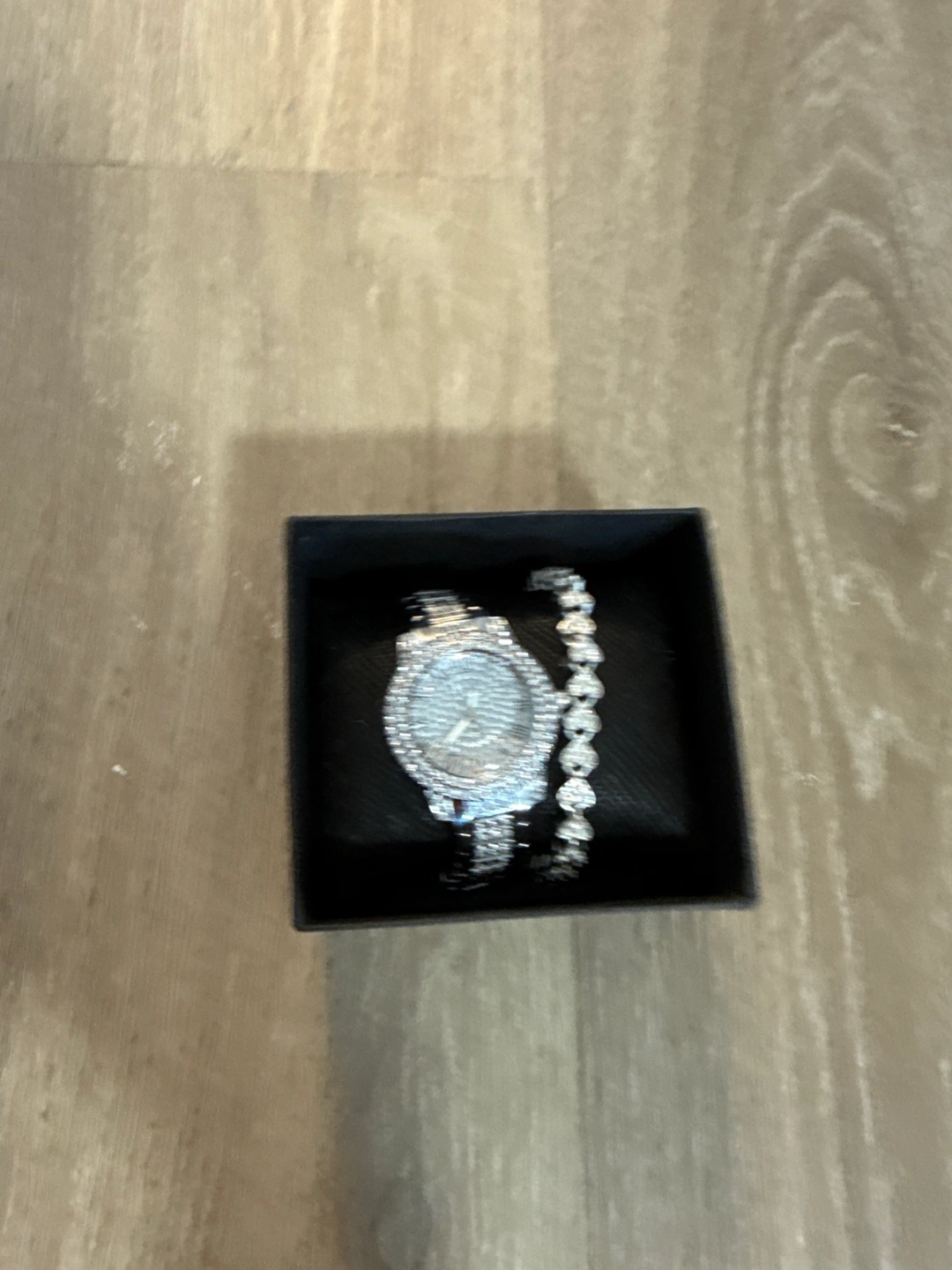 Selling a lovely rhinestone watch and matching bracelet set. They come in a box, perfect for gifting or keeping them safe. The set is in great condition and would add a touch of sparkle to any outfit!