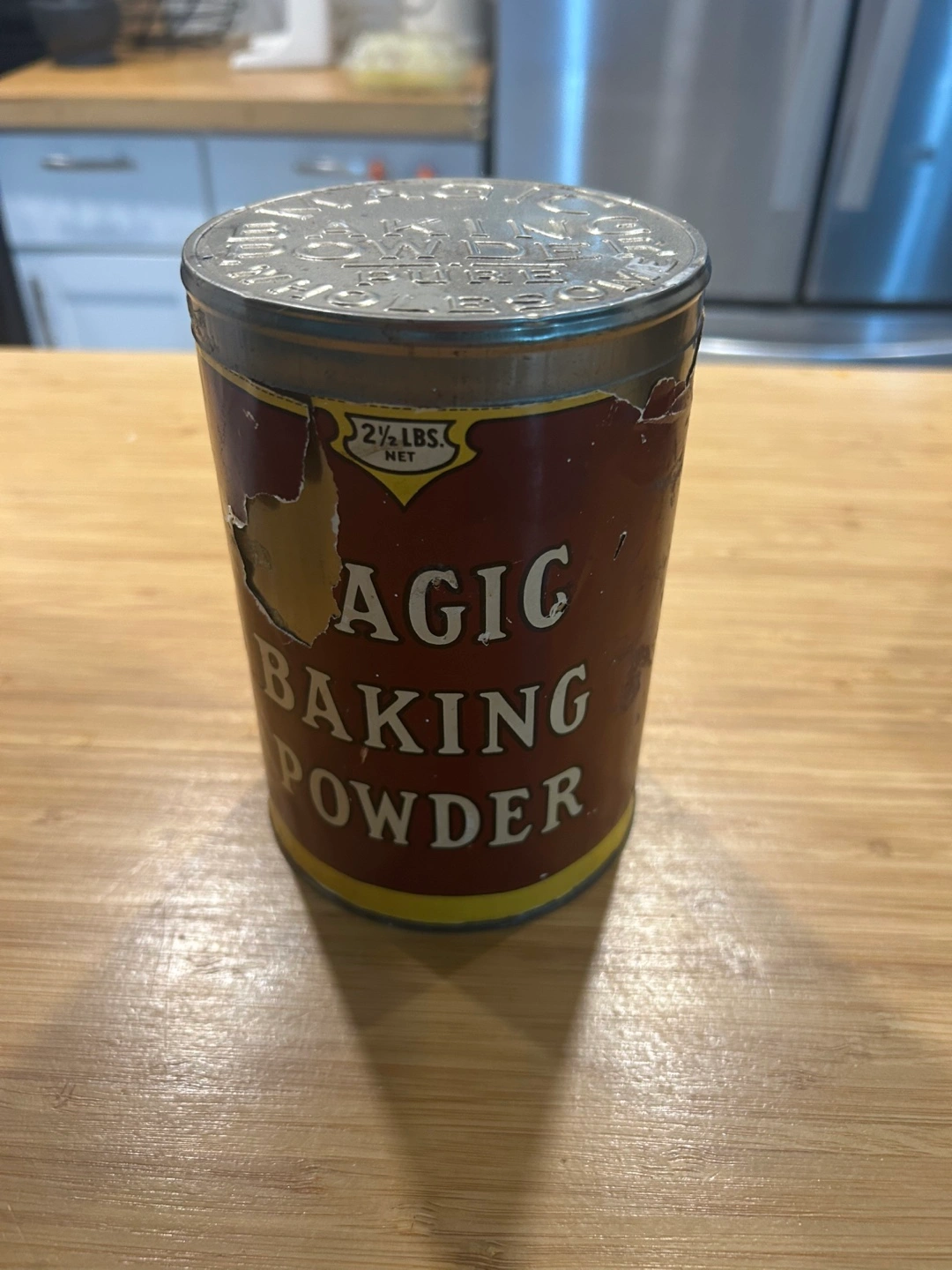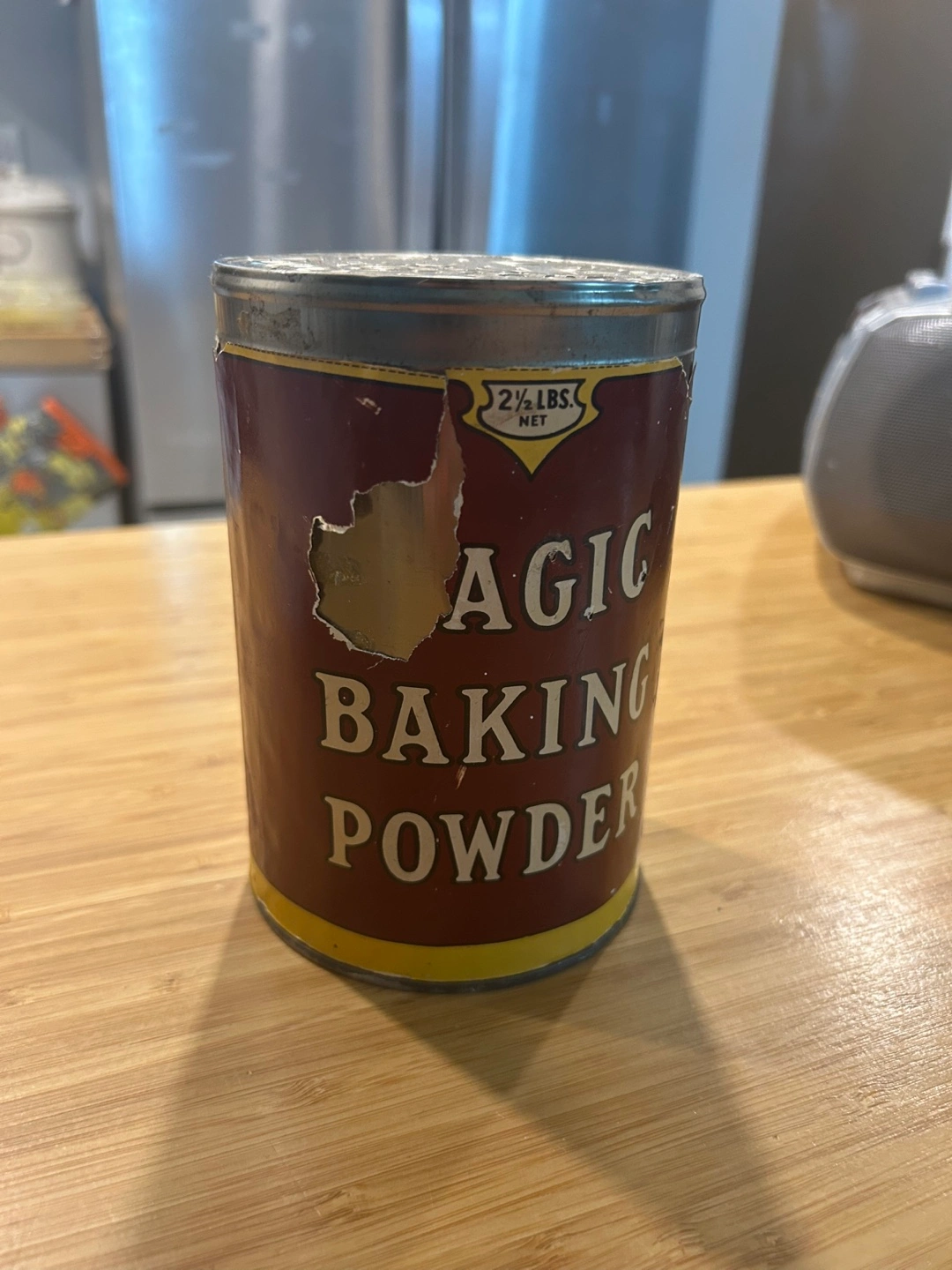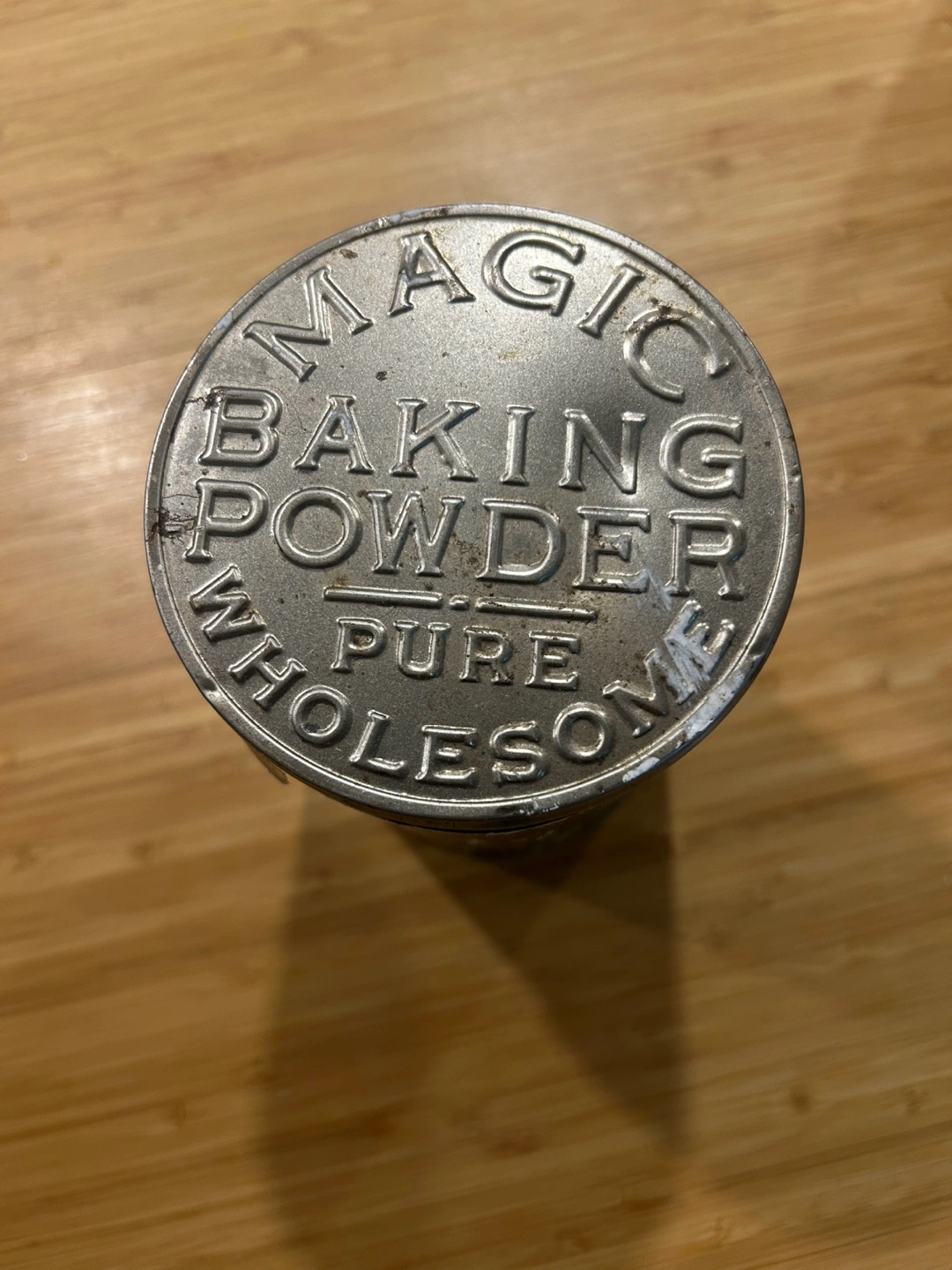 Selling a vintage Magic Baking Powder tin. It's a 2.5 lbs net weight container. The tin shows signs of wear but adds to its vintage charm! Perfect for collectors or as a decorative piece in your kitchen