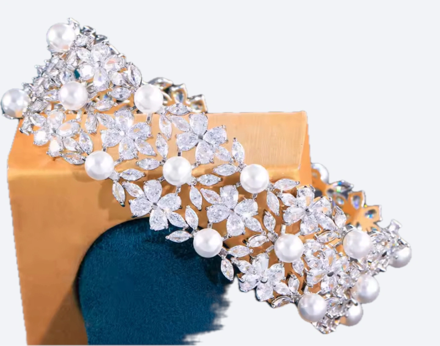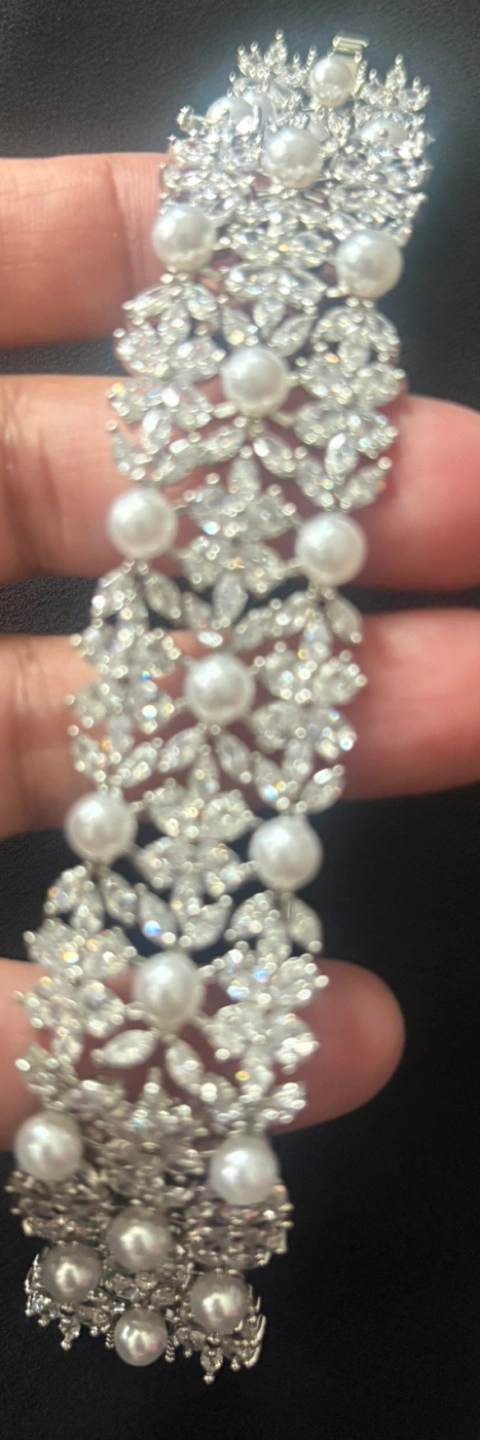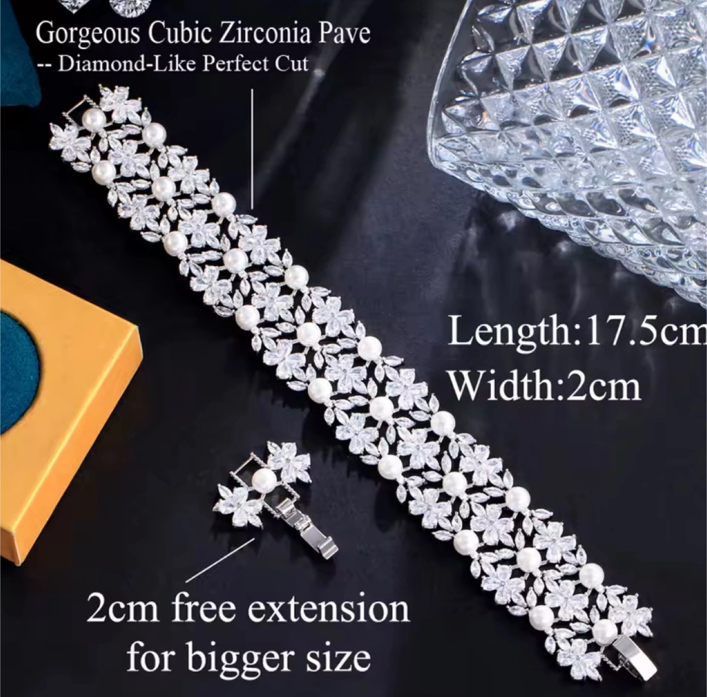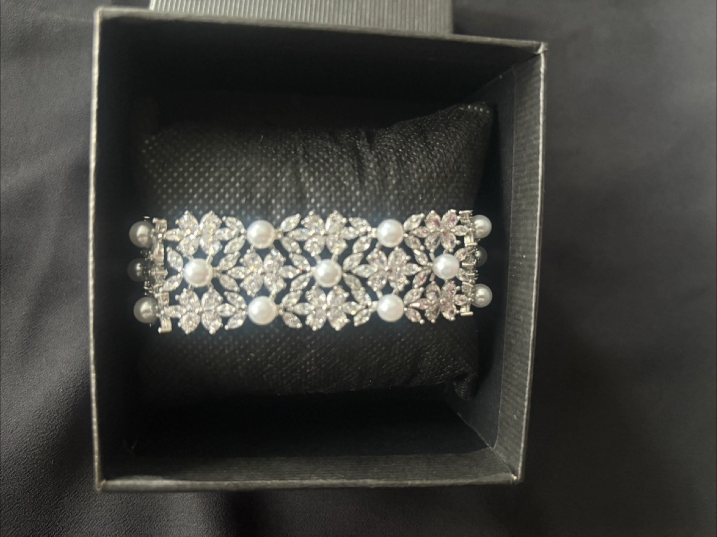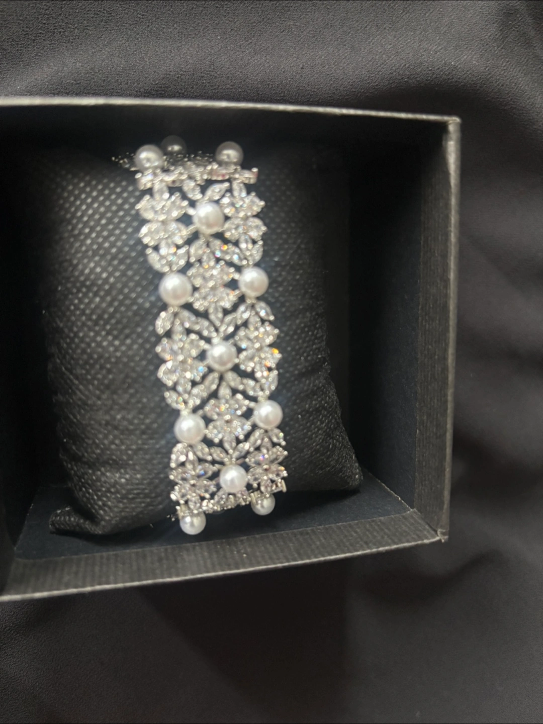This bracelet features a gorgeous cubic zirconia pave with diamond-like perfect cuts and beautiful pearls. It's brand new and comes in its original box! The bracelet is 17.5cm long and 2cm wide, with a 2cm free extension for a bigger size