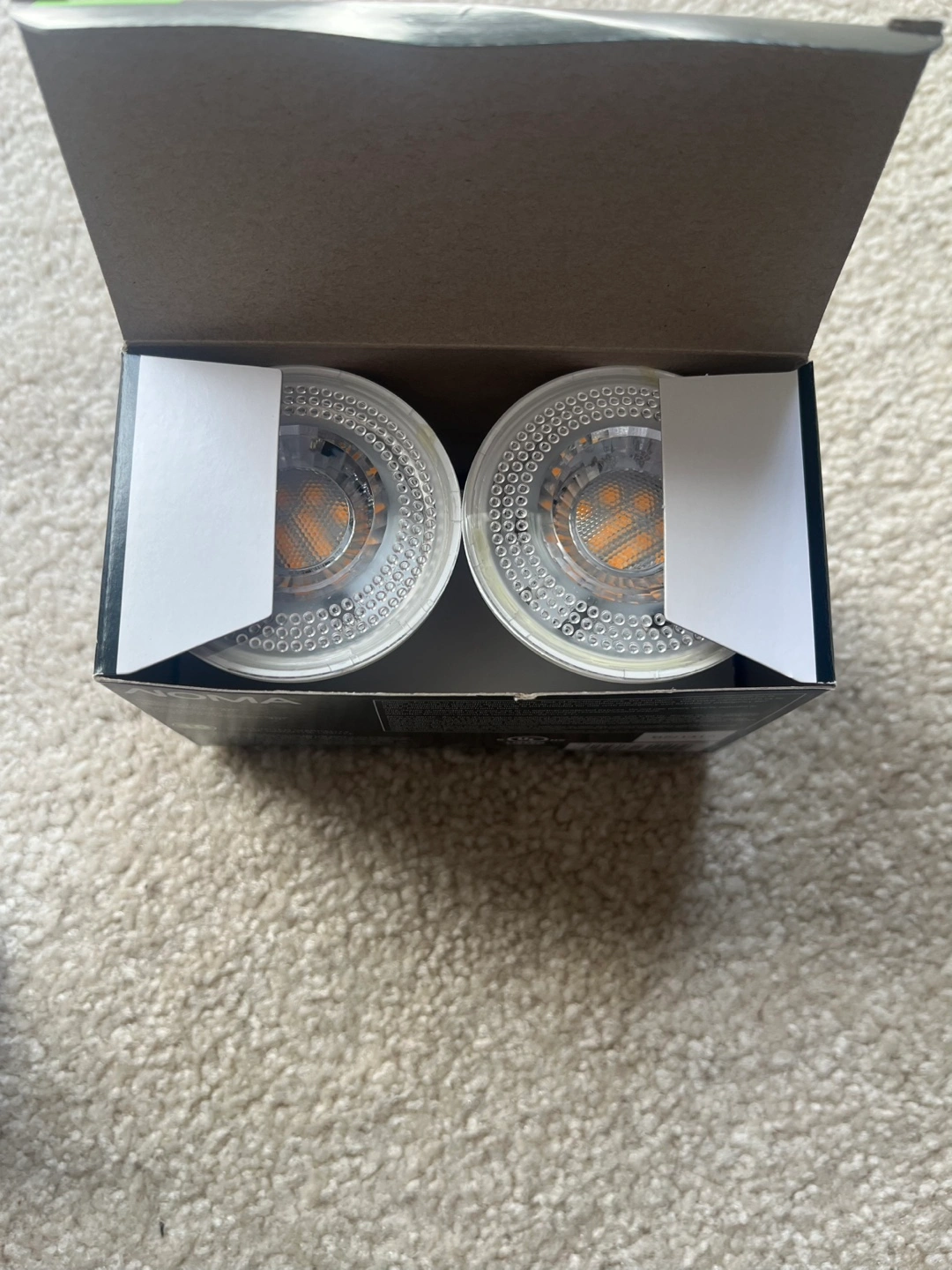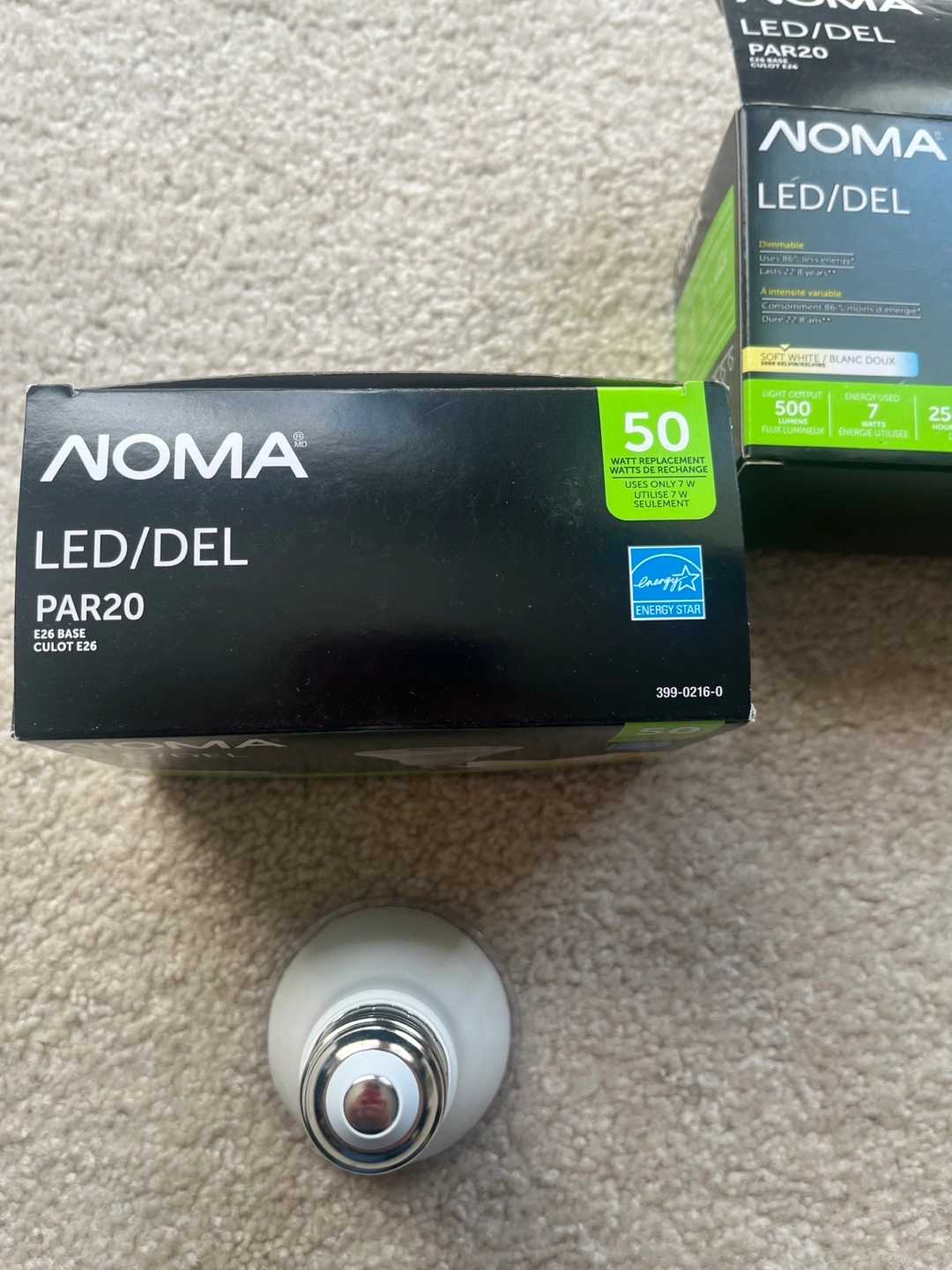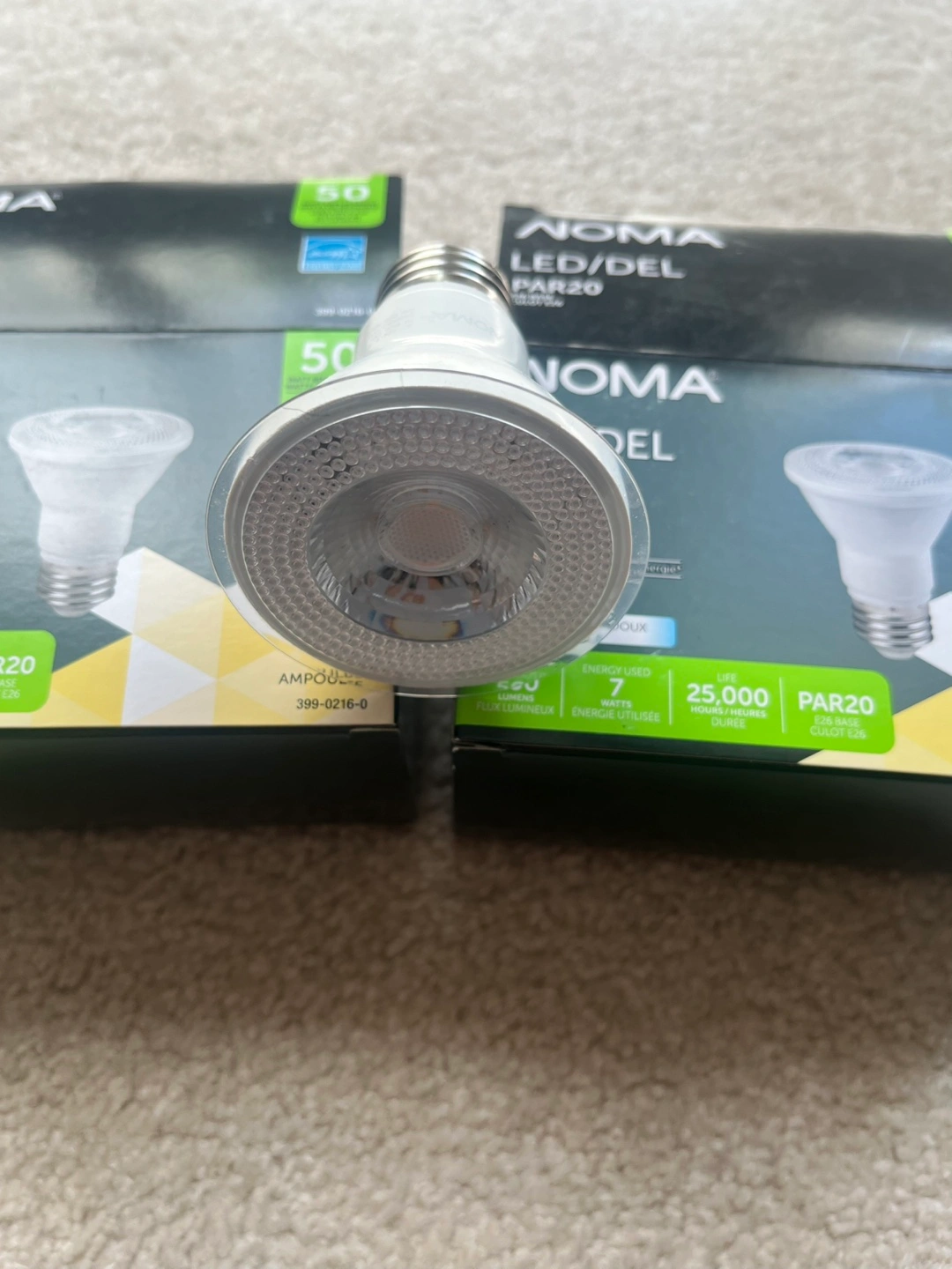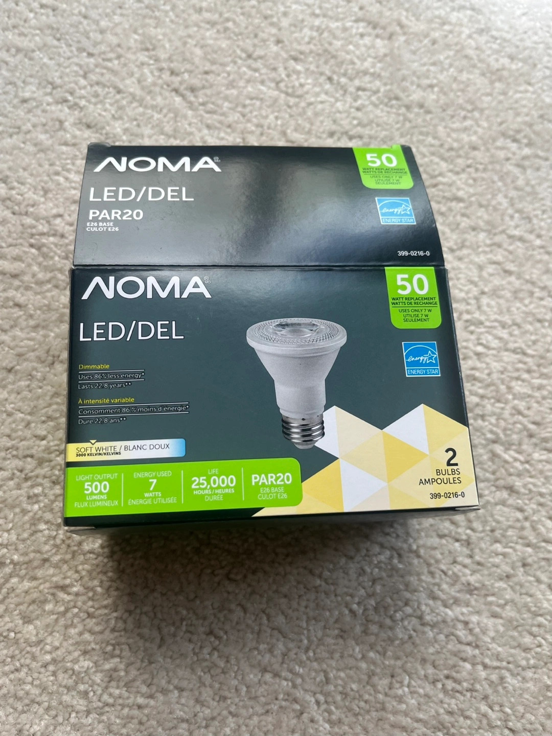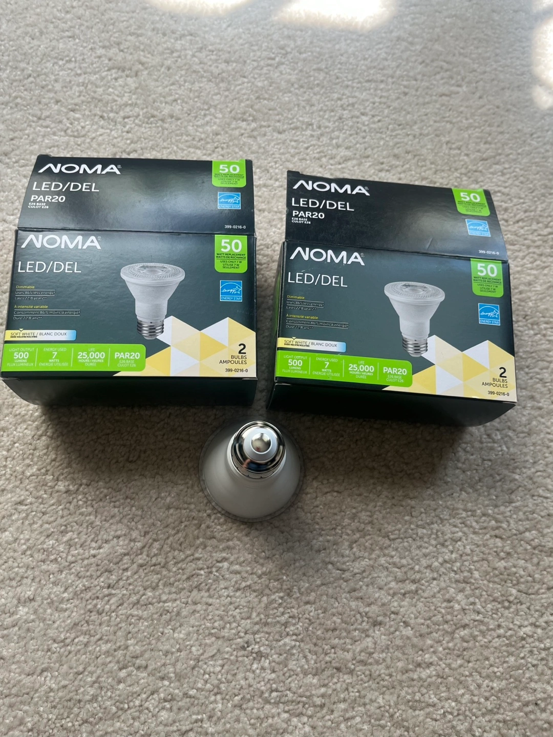 Selling a pack of two NOMA LED/DEL PAR20 light bulbs. They are 50-watt replacements that use only 7 watts. These bulbs have a life of 25,000 hours and are dimmable. They emit a soft white light. The box is included! Both for $5