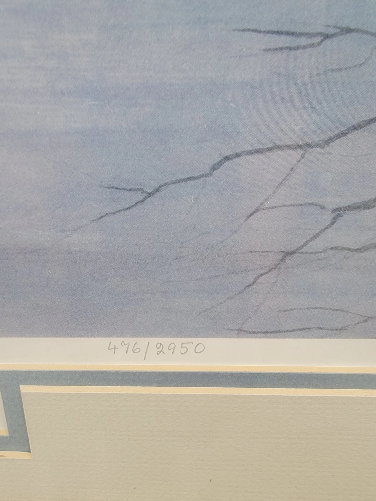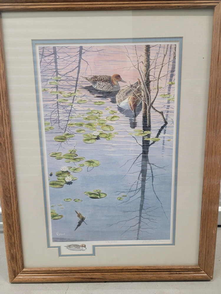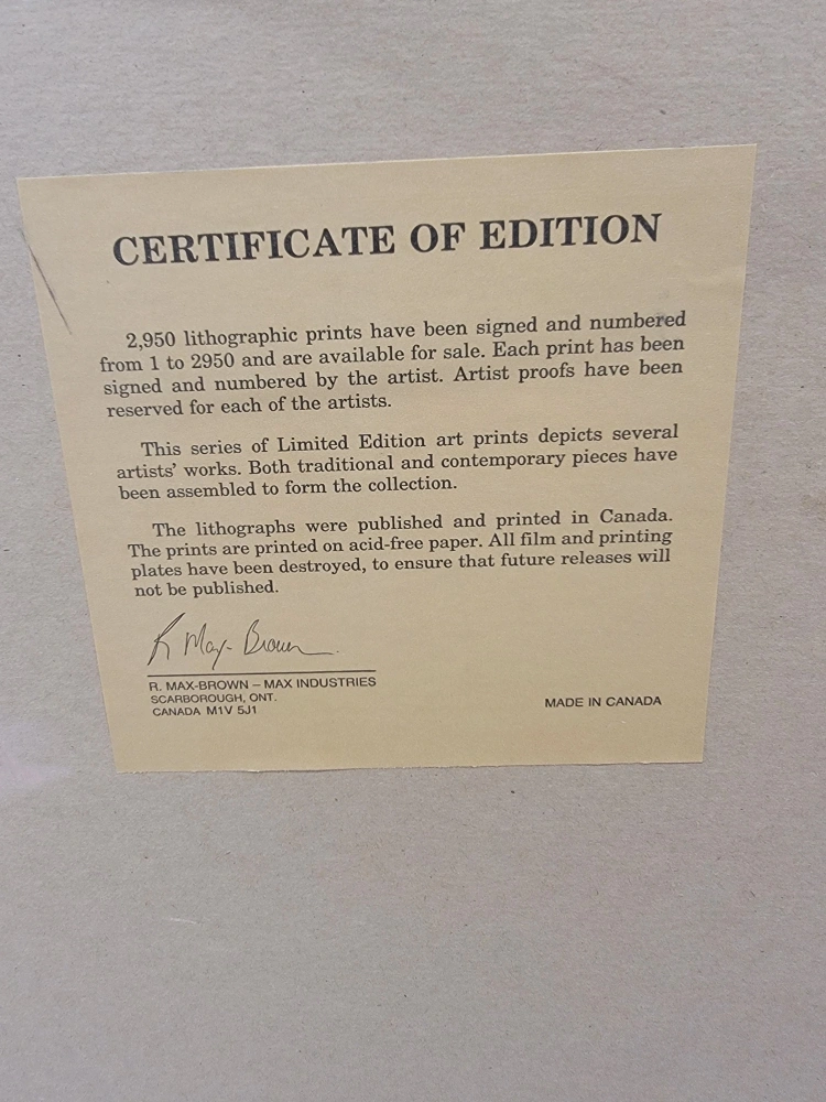 Framed lithographic print by Christine Wilson. This is a limited edition print, number 476 of 2,950. The lithographs were published and printed in Canada.
