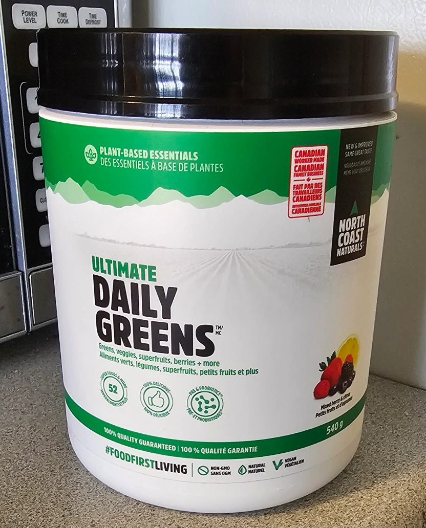 Selling a container of North Coast Naturals Ultimate Daily Greens. It contains greens, veggies, superfruits, berries and more! It's also 100% delicious and contains pre- and probiotics. It's a mixed berry and citrus flavour in a 540 g container
