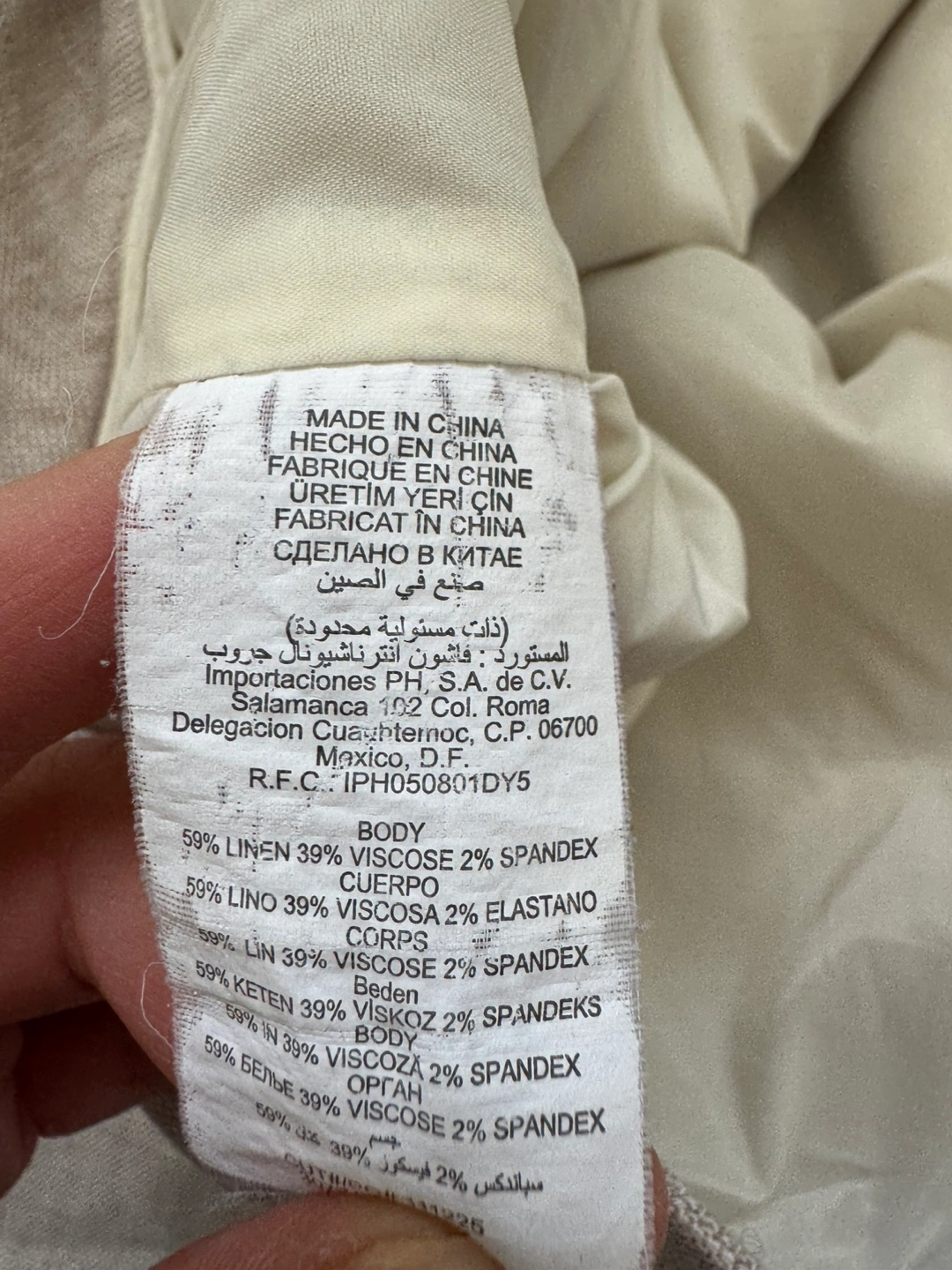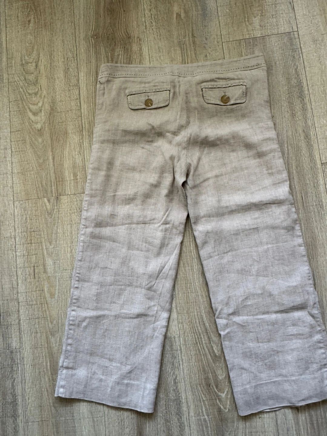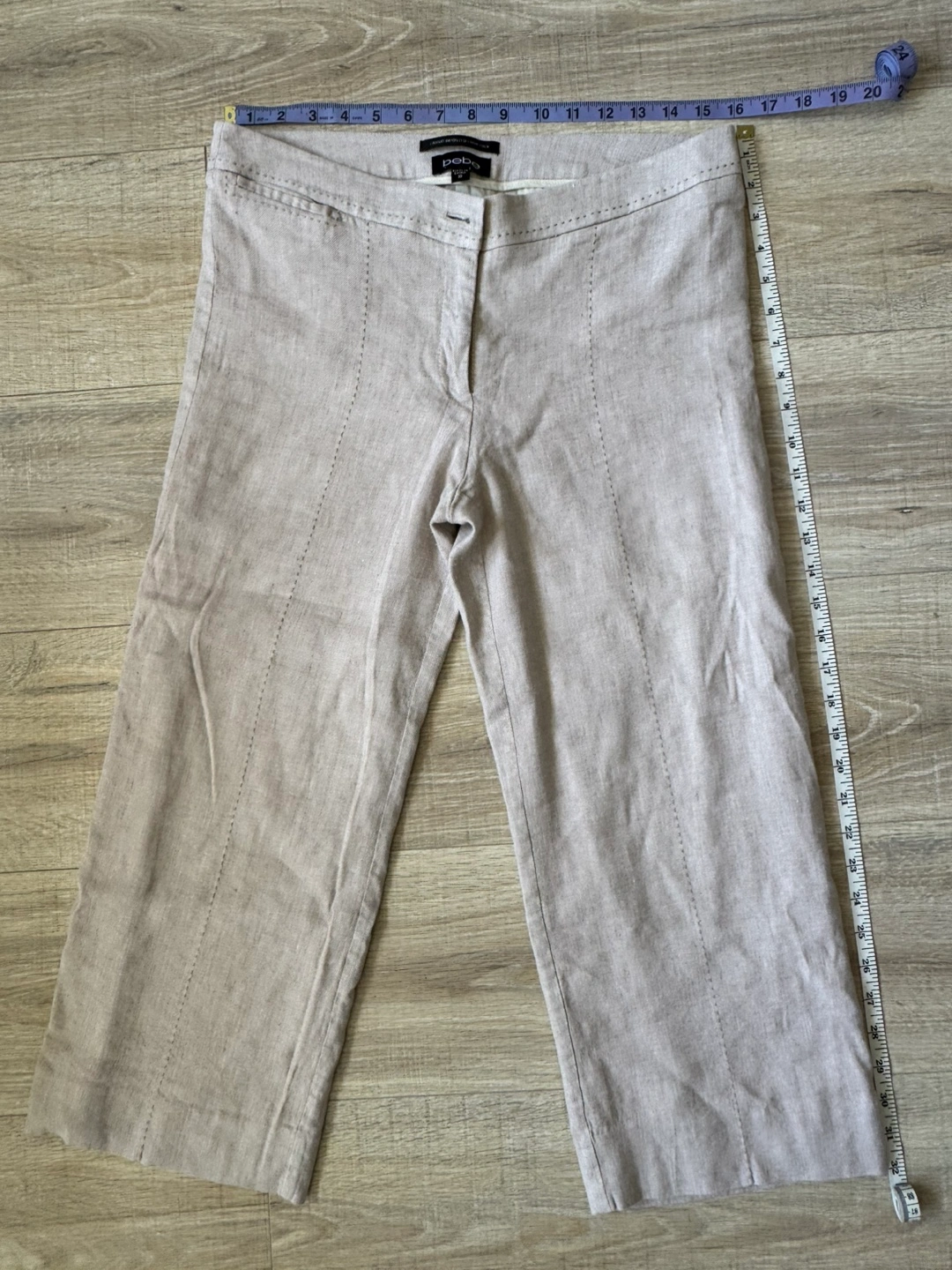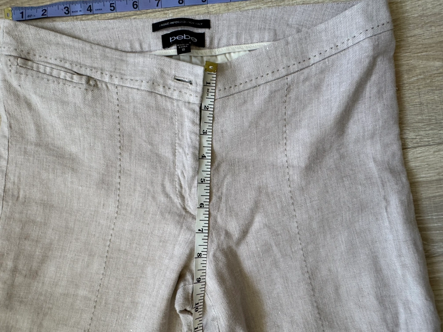 Bebe summer capri pants in a neutral colour, perfect for warmer weather! These are a size 10 and made of 59% linen, 39% viscose, and 2% spandex for a comfortable fit