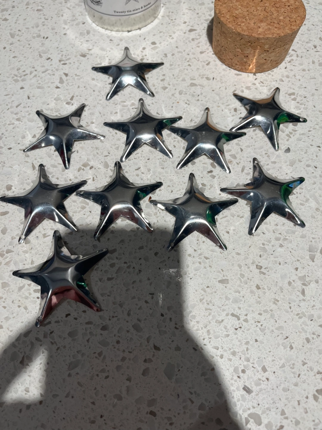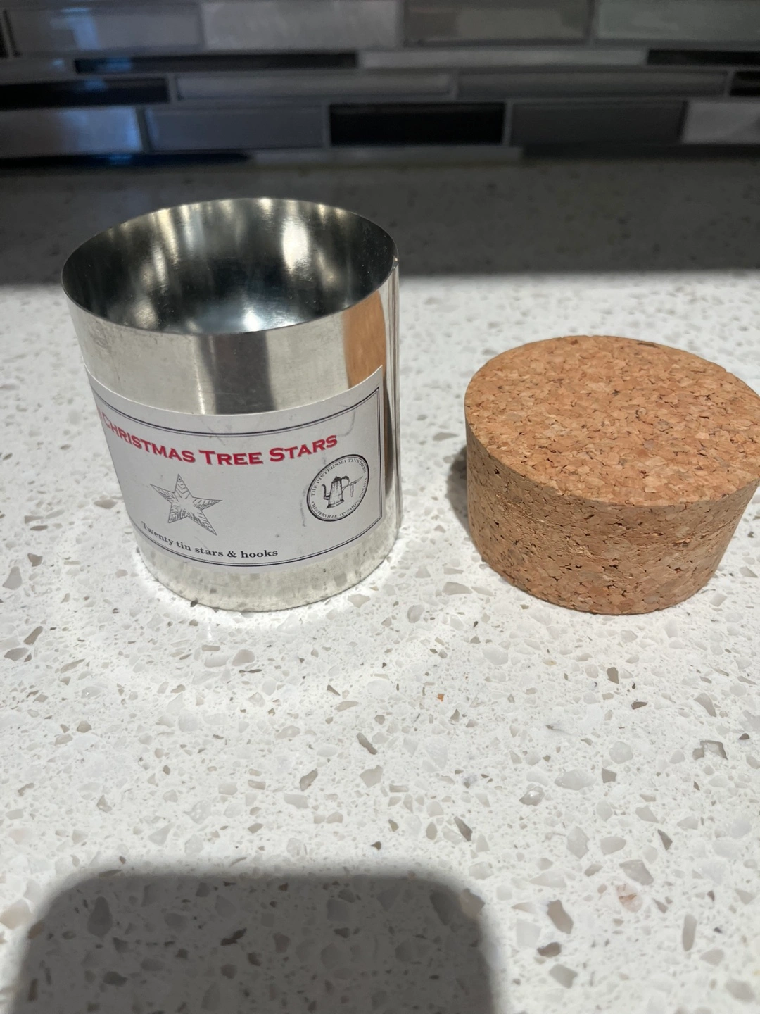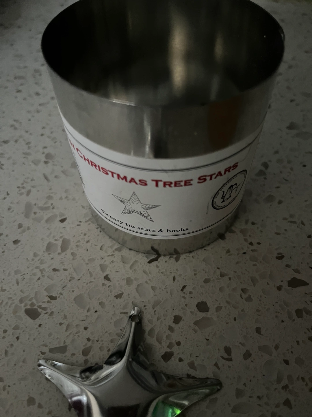 Selling a set of tin Christmas tree stars with holes It includes 10 tin stars and hooks and comes in the original container with a cork lid