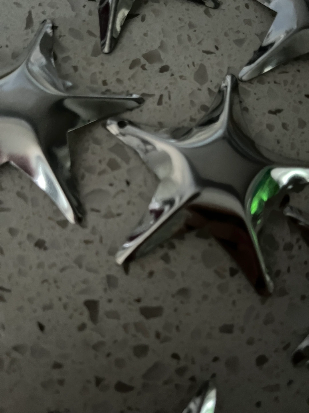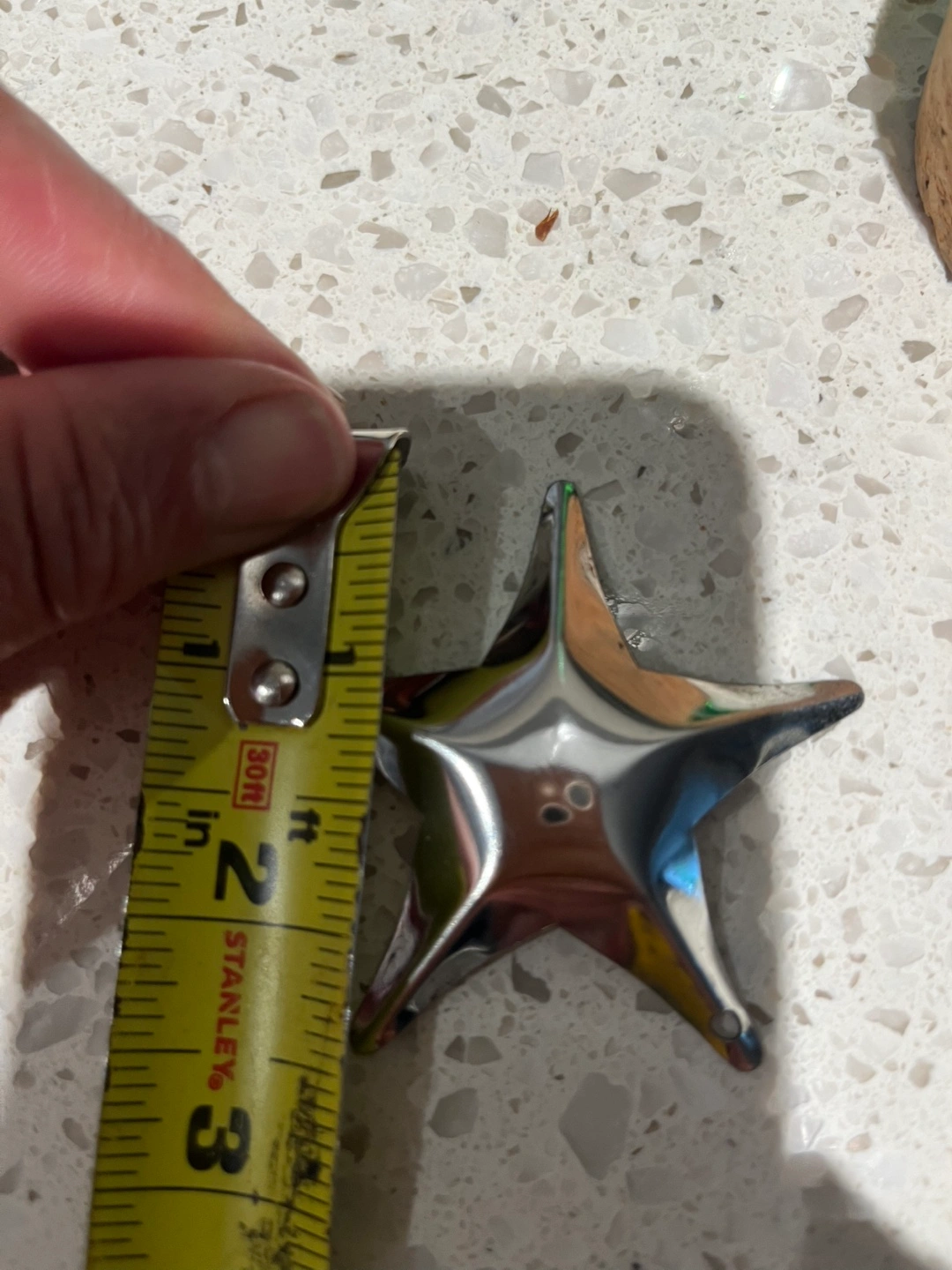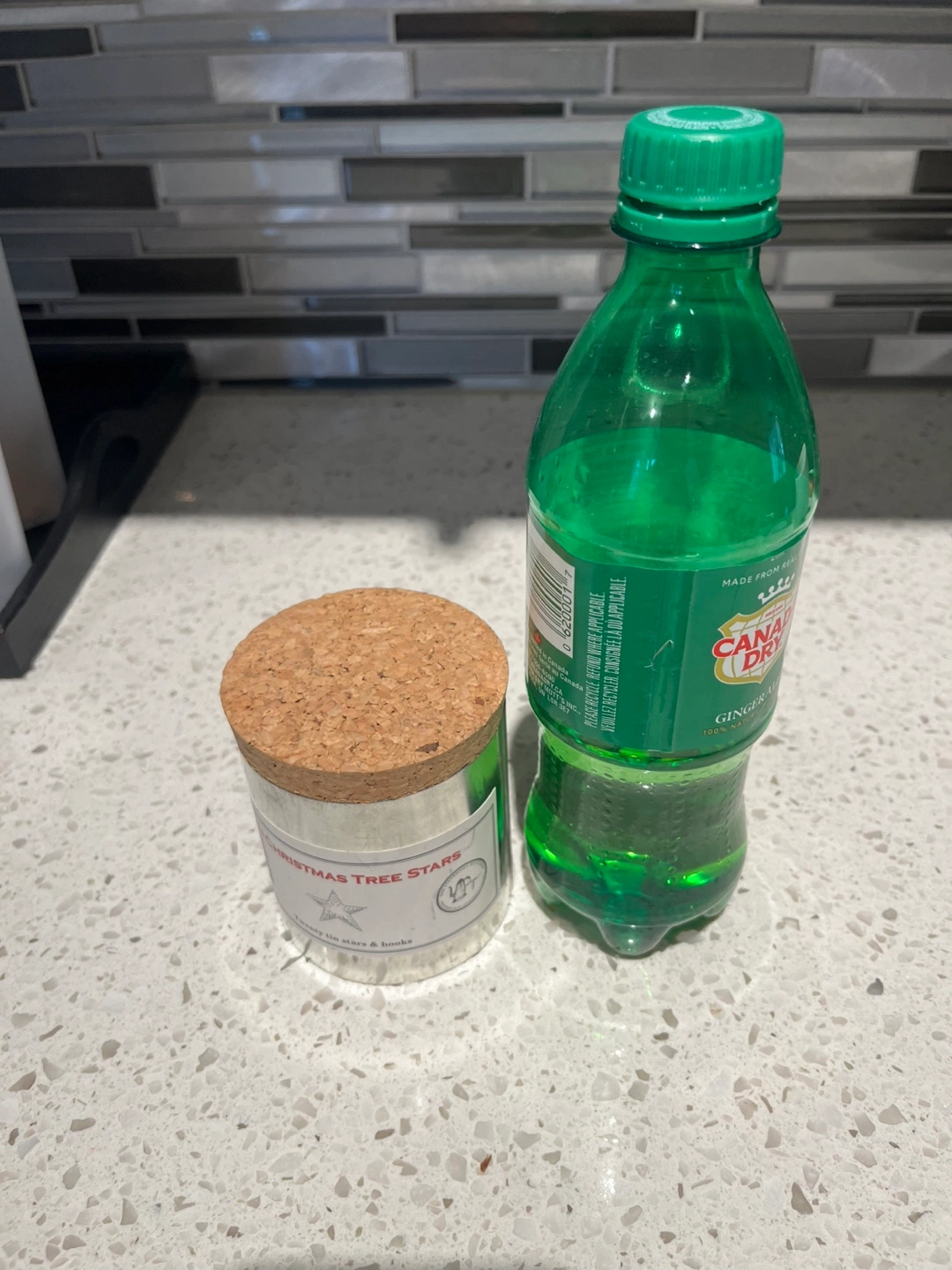 Selling a set of tin Christmas tree stars with holes It includes 10 tin stars and hooks and comes in the original container with a cork lid