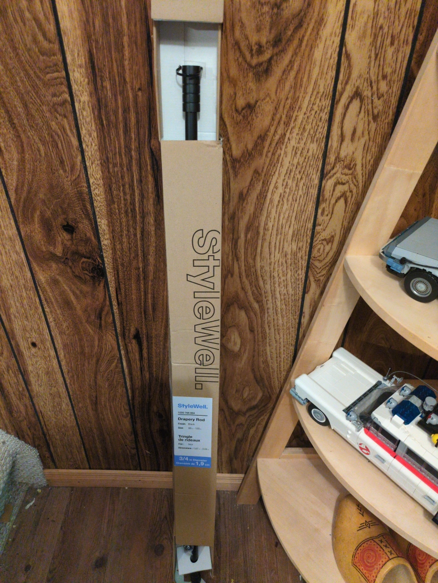Here's a StyleWell drapery rod in black! It's sized 66 inches to 120 inches, or 1.67 metres to 3.04 metres. It's 3/4 in diameter or 1.9 cm. The box is included