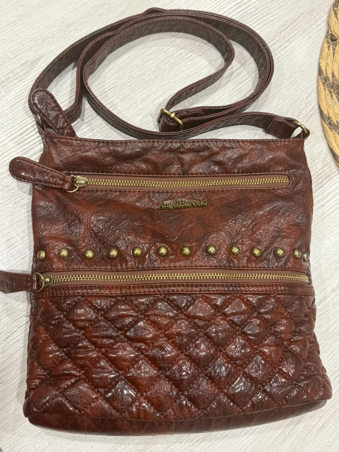 Selling a gently used Angel Barcelo crossbody bag in brown. It features a quilted pattern and studded detailing, adding a touch of style! The bag has multiple zippered compartments to keep your belongings organized. Originally bought for $83.10