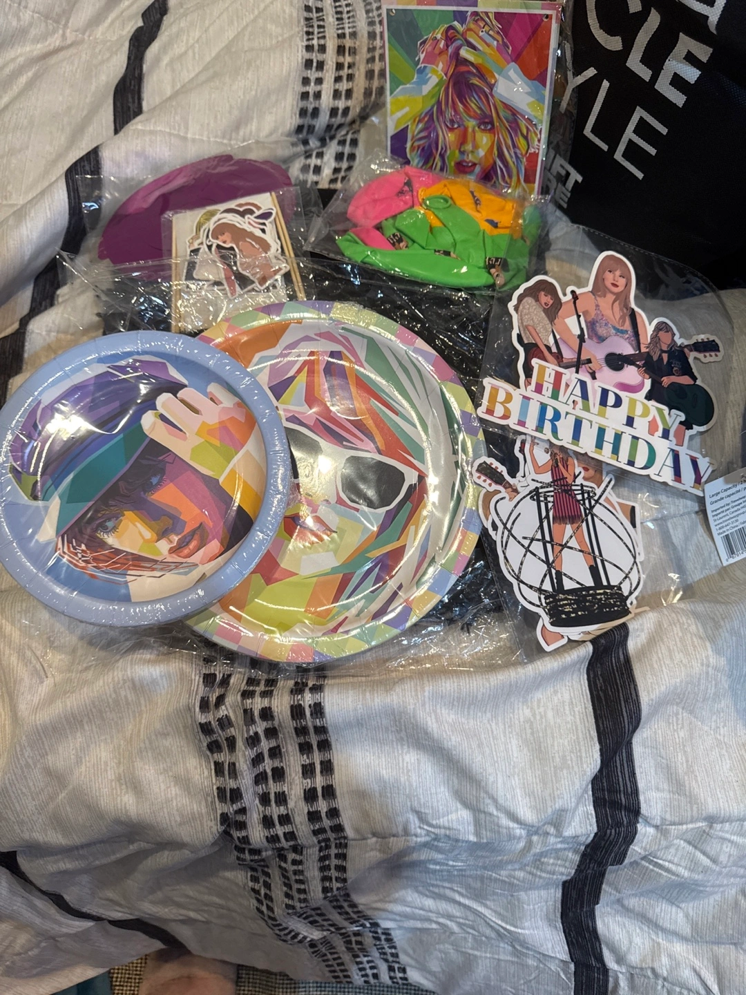 Selling a set of Taylor Swift themed birthday party supplies! Includes plates, balloons, stickers, and a Happy Birthday cake topper. Perfect for a Swiftie's birthday bash!