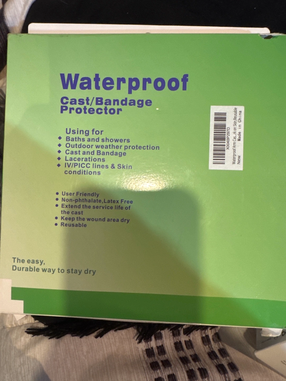 I'm selling a brand new waterproof cast/bandage protector! It's perfect for keeping casts and bandages dry while showering or bathing. It's also great for outdoor weather protection, lacerations, and IV/PIC lines & skin conditions. It's user-friendly, non-phthalate, and latex-free, extending the service life of the cast. Plus, it keeps the wound area dry and is reusable
