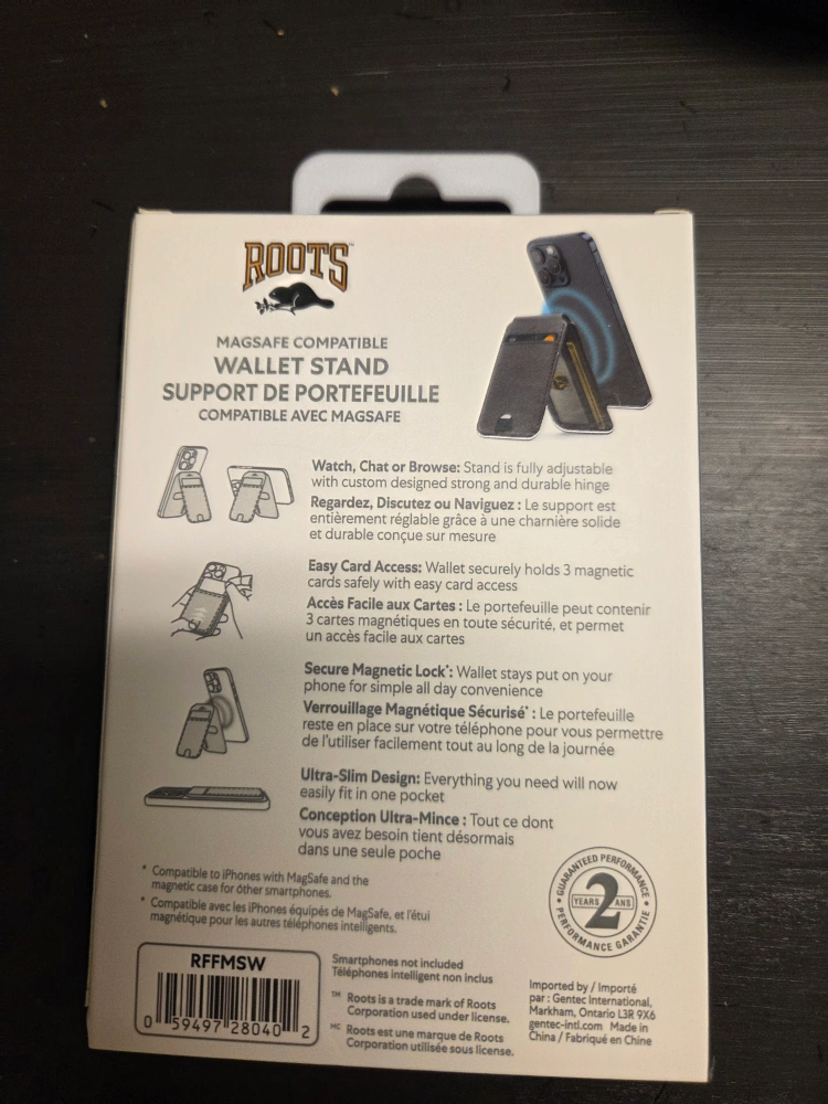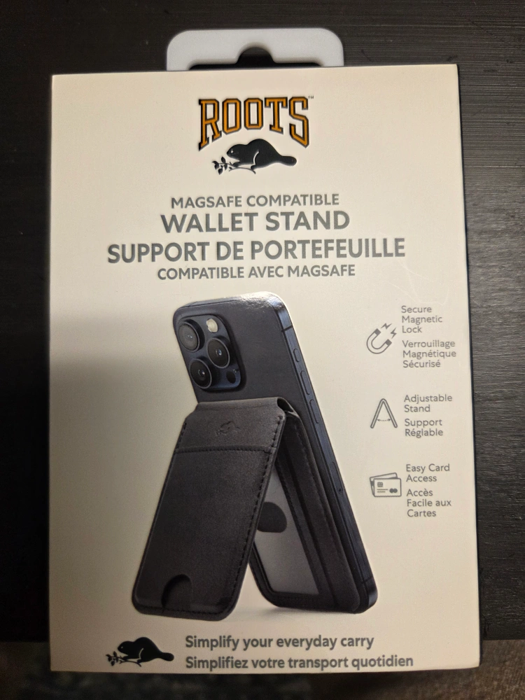Selling a Roots MagSafe compatible wallet stand. It's designed to securely hold 3 magnetic cards, and the stand is fully adjustable with a durable hinge. The wallet stays put on your phone for simple all-day convenience. Simplify your everyday carry with this ultra-slim design! Box included