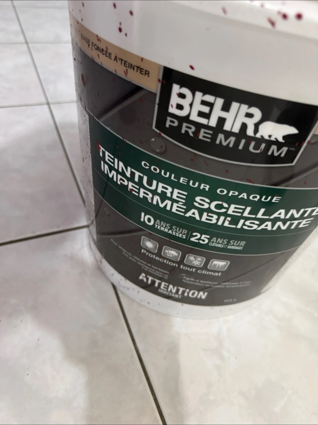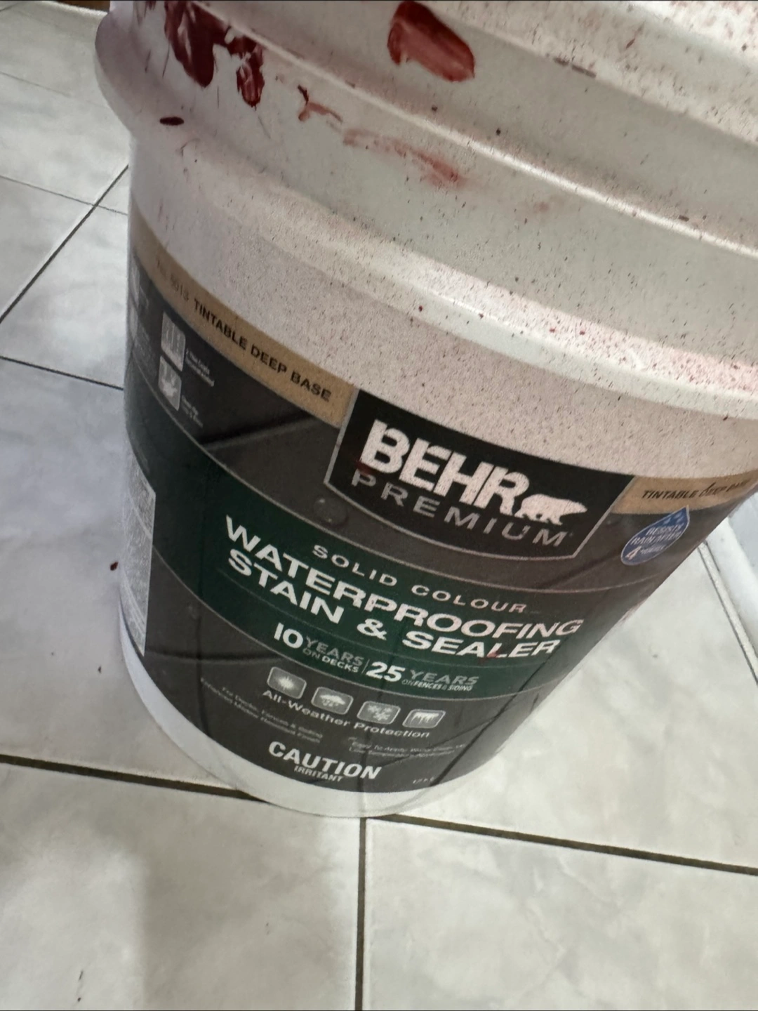 I have a 5-gallon bucket of Behr Premium Solid Colour Waterproofing Stain & Sealer in Barn Red. This is a great choice for decks and fences, offering 10 years of protection on decks and 25 years on fences and siding I bought from Home Depot and change my mind with the colour Originally this gallon is for more than $300 plus tax I am selling only $100 cash