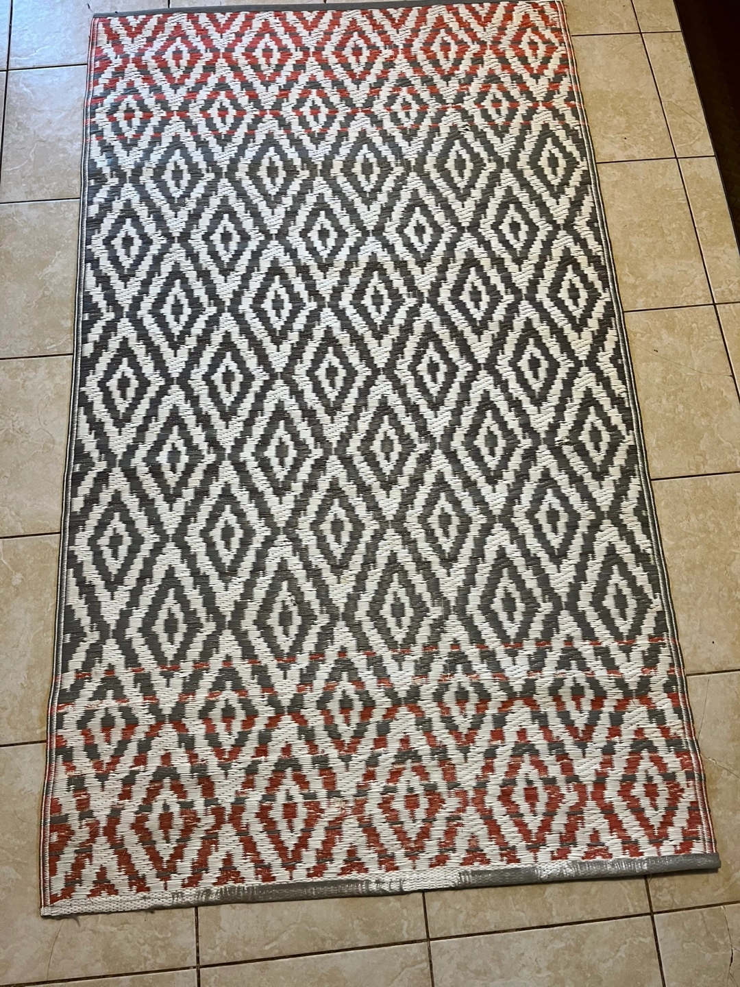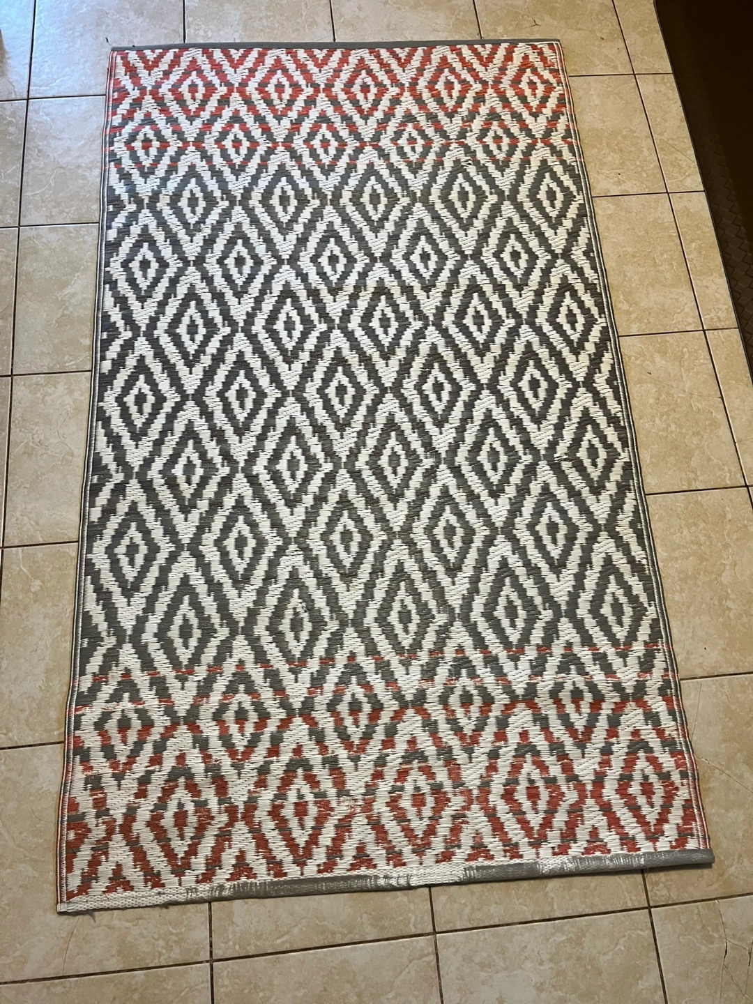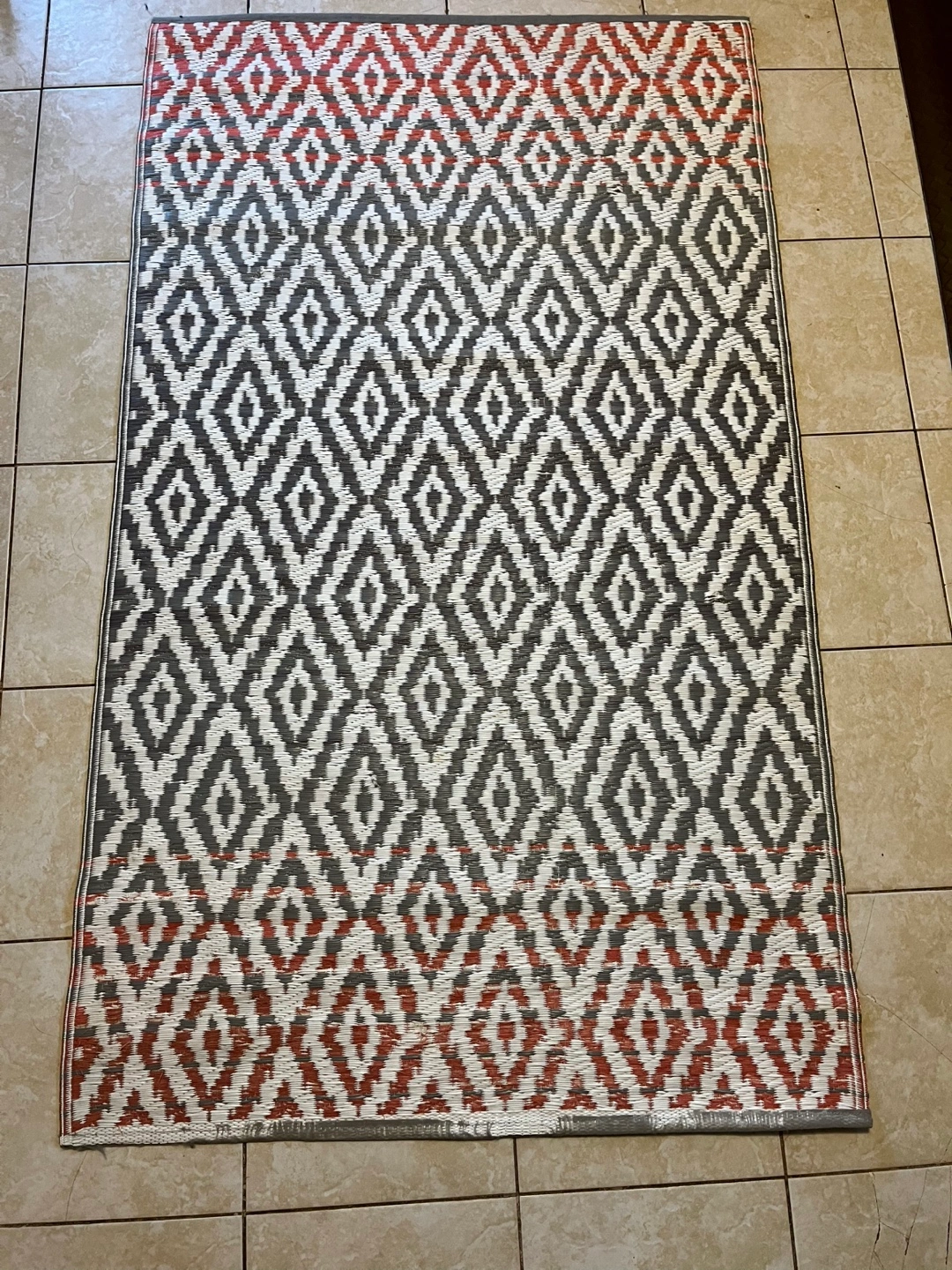 This is a patterned rug for outdoors. It measures approximately 32 inches by 60 inches. It has a geometric diamond pattern in shades of white, grey, and red.