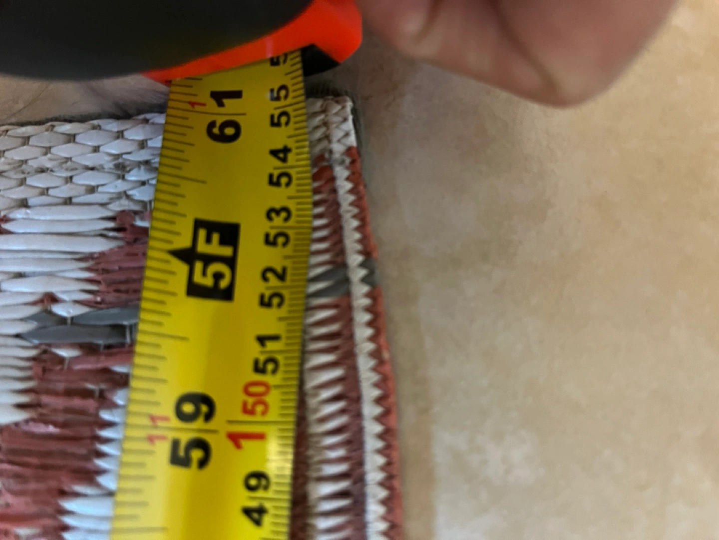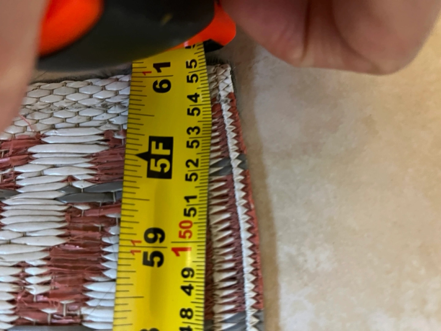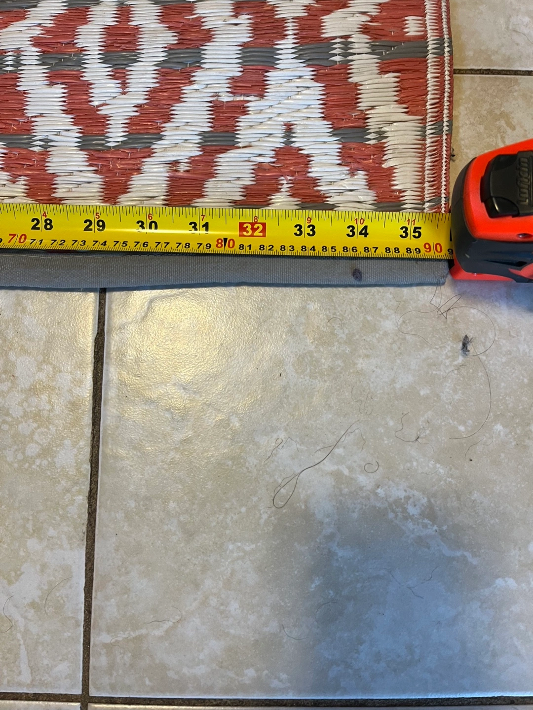 This is a patterned rug for outdoors. It measures approximately 32 inches by 60 inches. It has a geometric diamond pattern in shades of white, grey, and red.