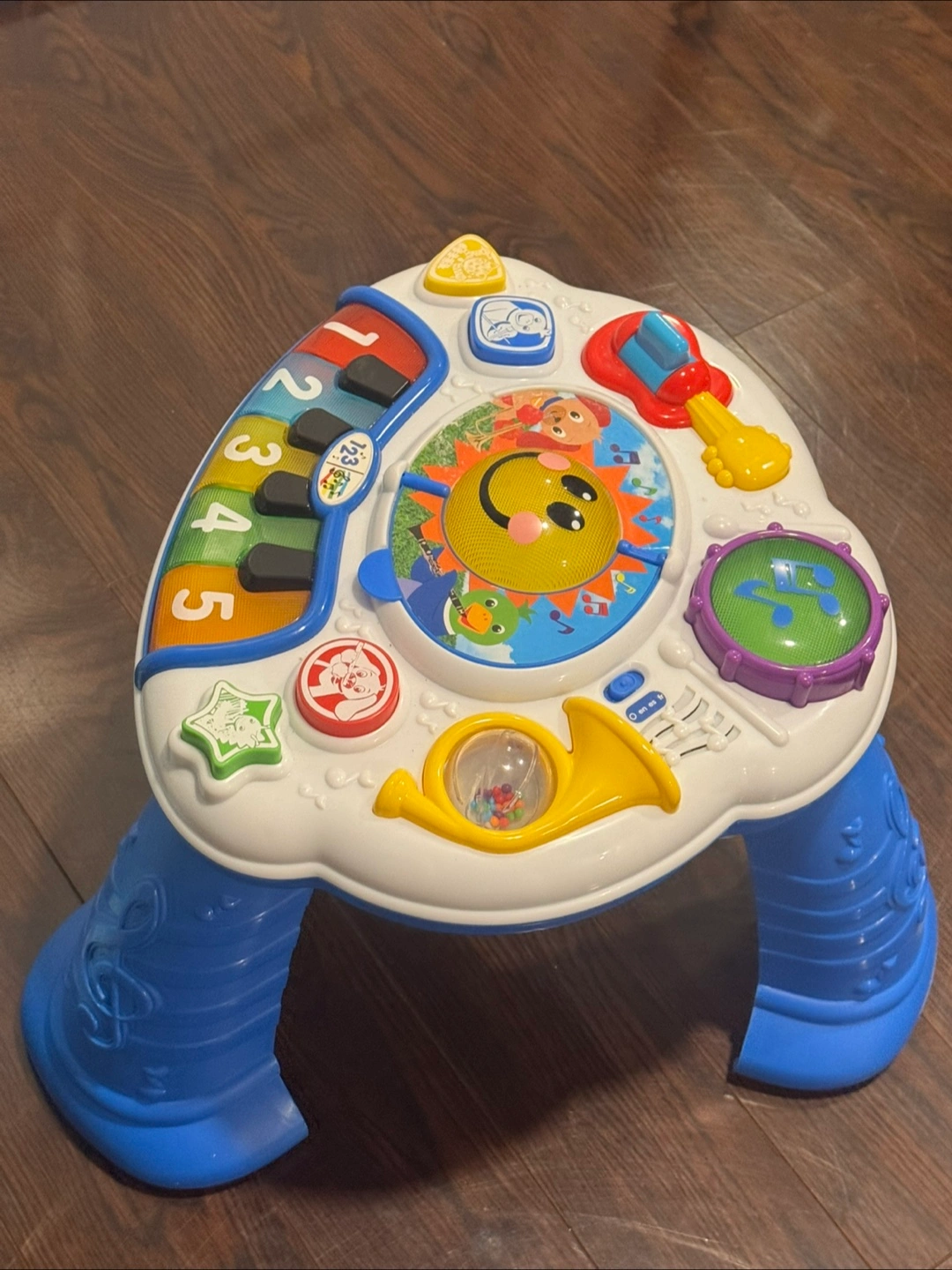 This is a CoComelon Musical Learning Table! It's perfect for toddlers who love to explore and learn through music and play. It features a variety of interactive elements, including a piano, drum, and other fun activities to keep your little one entertained