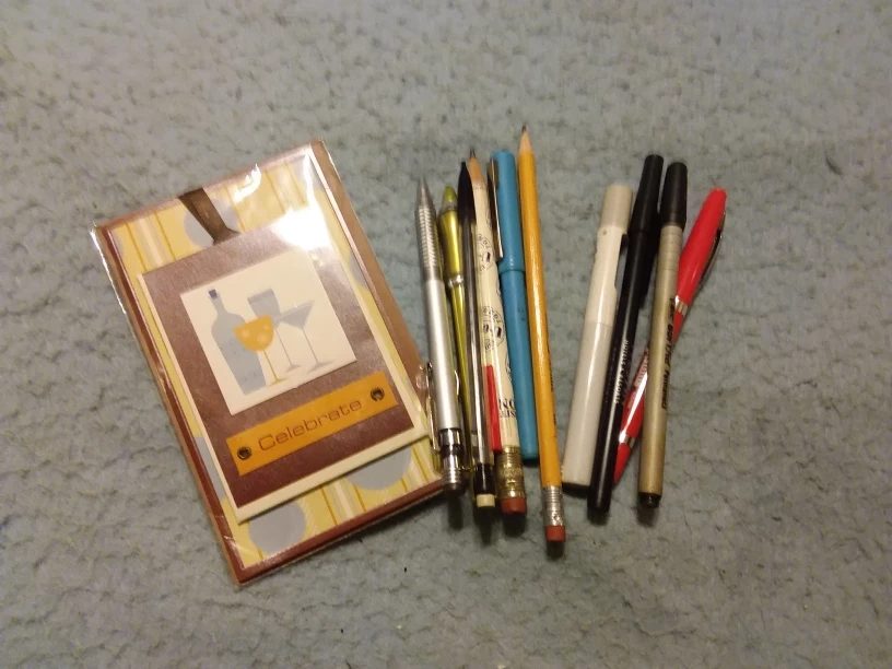 Selling a collection of assorted pens and a sealed celebration card. Perfect for everyday use or special occasions! The pens include ballpoint, felt tip, and pencils. πππ No limit on asking for π items. Pickup today only until 9 pm.