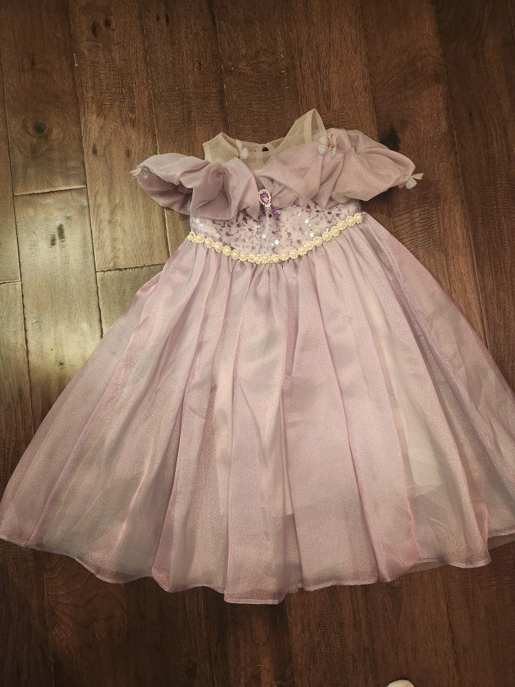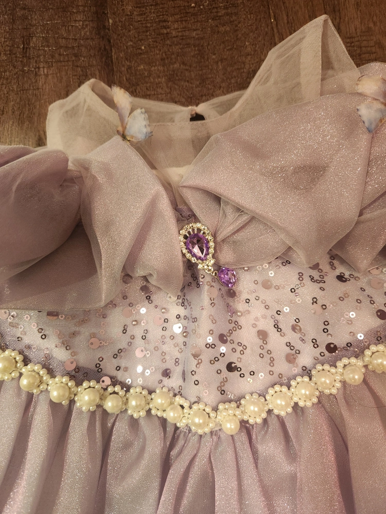 A beautiful lilac dress featuring sequins, pearls, and a decorative jewel. Perfect for a special occasion or dress-up!60cm Bust and 72cm height.